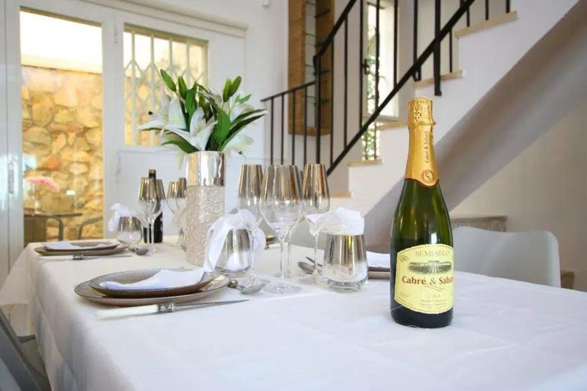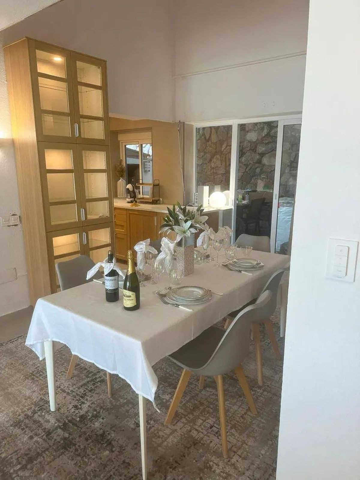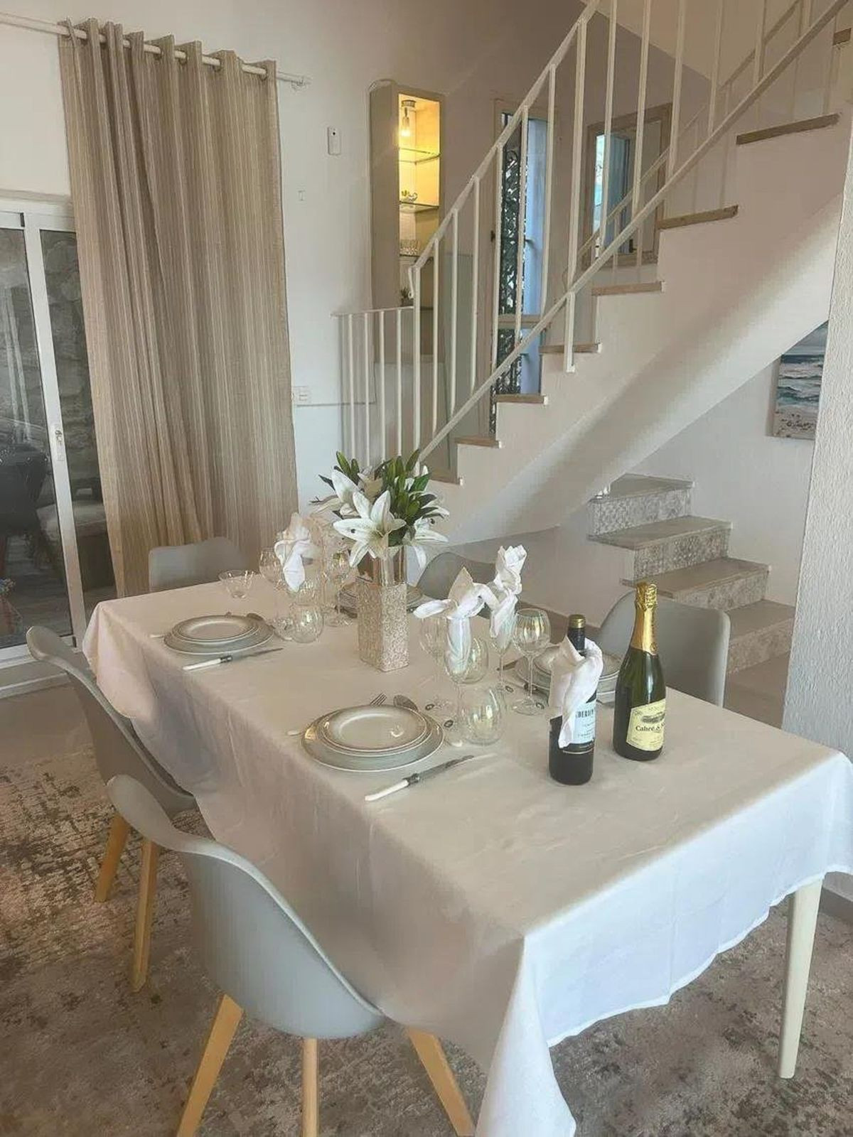 This stunning property features four spacious bedrooms and two bathrooms, thoughtfully designed across two levels to maximize comfort and style. The impressive interior dining area boasts soaring 5-meter-high ceilings, enhancing the sense of space and elegance. A charming front garden opens directly to uninterrupted views of the Mediterranean, providing the perfect setting for relaxation.