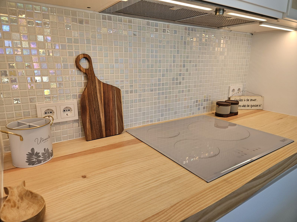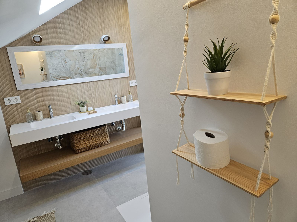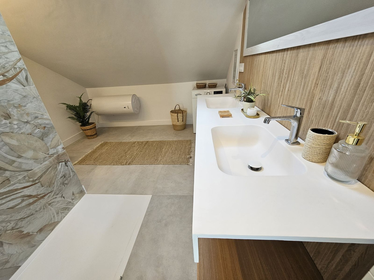 On the ground floor, you will find an elegant open-plan living room with an integrated kitchen, a cozy bedroom, and a modern bathroom. From here, you access a stunning partly covered terrace with a chill-out area and a private pool, ideal for enjoying sunny days. The entrance to the home also has another small outdoor space. The first floor offers two more bedrooms, with a private terrace at the master bedroom and a second bathroom, perfect for everyone's comfort. The private and closed double garage is located in the basement.