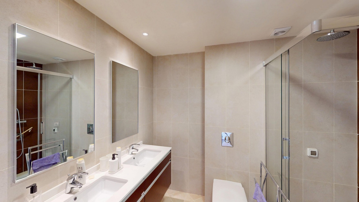 This contemporary penthouse in Mijas, Málaga, offers a harmonious blend of comfort and style. It is located directly on a golf course and offers an impressive view of the sea, so you can enjoy both the tranquillity of the green and the panorama of the coast. The open-plan living area features floor-to-ceiling windows that flood the space with natural light and provide stunning panoramic views of the surrounding landscape. The living room is tastefully furnished with a plush white sectional sofa, accented by vibrant area rugs that add warmth to the polished floors. The sleek kitchen boasts modern navy cabinetry contrasted with white countertops and high-end stainless steel appliances, creating a sophisticated culinary space. The penthouse's three bathrooms are elegantly appointed, with one showcasing a floating double vanity in rich wood tones and a glass-enclosed shower. The primary bedroom is a serene retreat with direct access to a private terrace. It features a canopied bed, a spacious walk-in closet, and a luxurious en-suite bathroom with both a bathtub and a shower. The second bedroom offers equally impressive views and is furnished with a comfortable double bed. A dedicated office space provides a functional work area with a modern desk setup and ample natural light. The crowning feature of this property is the private terrace, complete with a swimming pool and expansive views of the surrounding hills and greenery. Additionally, the penthouse includes two parking spaces and two storage rooms. Residents also have access to excellent communal amenities, including a large swimming pool, a heated pool, and an outdoor kitchen that can be used by everyone. With its thoughtful layout, luxurious amenities, and prime location in Urbanización Cerrado del Águila, this penthouse offers a perfect balance of indoor comfort and outdoor living in the heart of Costa del Sol. We are pleased to be able to present this dream property to you soon, either personally or via virtual viewing. Because this world is unique - just like our Axarquía. In Andalusia. On the Costa del Sol. Here, on the sunny side of life...