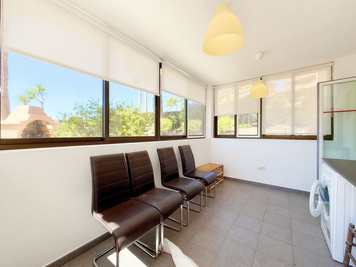 The property, all on one level, is spacious, bright, and extremely comfortable. It features four bedrooms and two bathrooms, a large living room with direct access to the terrace and private garden, from where you can enjoy spectacular views of the golf course and the sea. Thanks to its elevated position, the apartment offers a sense of privacy and tranquility, allowing for a peaceful living experience surrounded by nature.