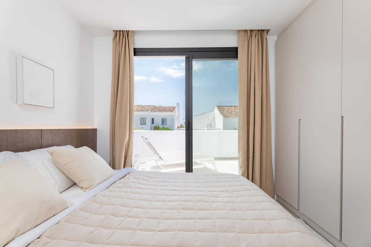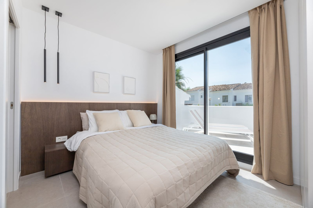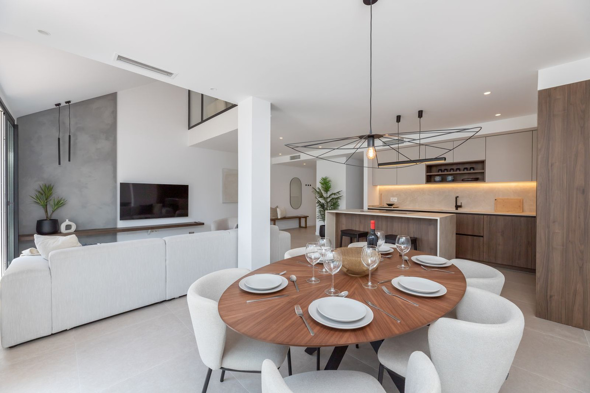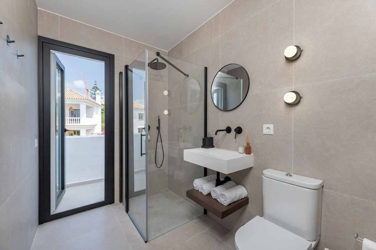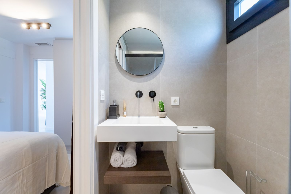 This modern 3-bedroom townhouse is bright and spread over 2 floors. The ground floor features a modern open-plan layout with a fully equipped kitchen, a spacious living room, and a dining area. Large sliding doors lead out to a private terrace, complete with a barbecue station, outdoor dining area, and lounge seating—perfect for enjoying the Marbella lifestyle year-round. On the ground floor, there is a guest WC and also one en-suite bedroom/bathroom.