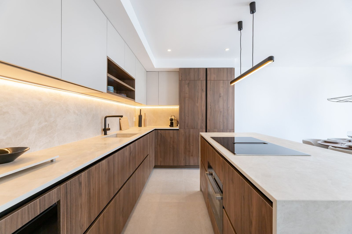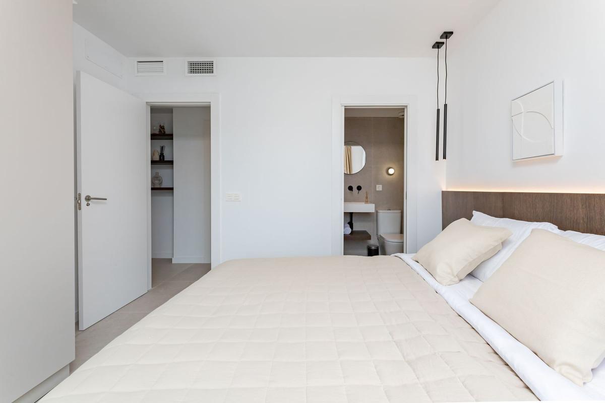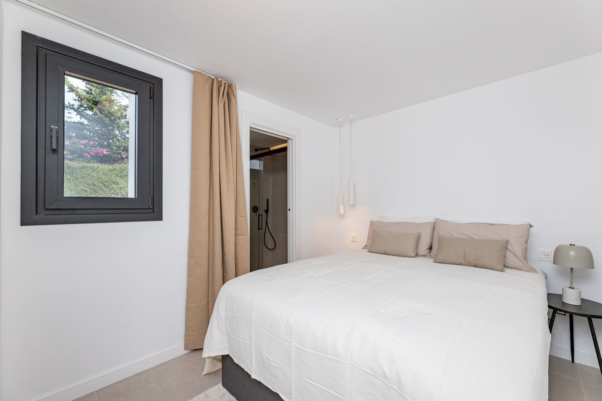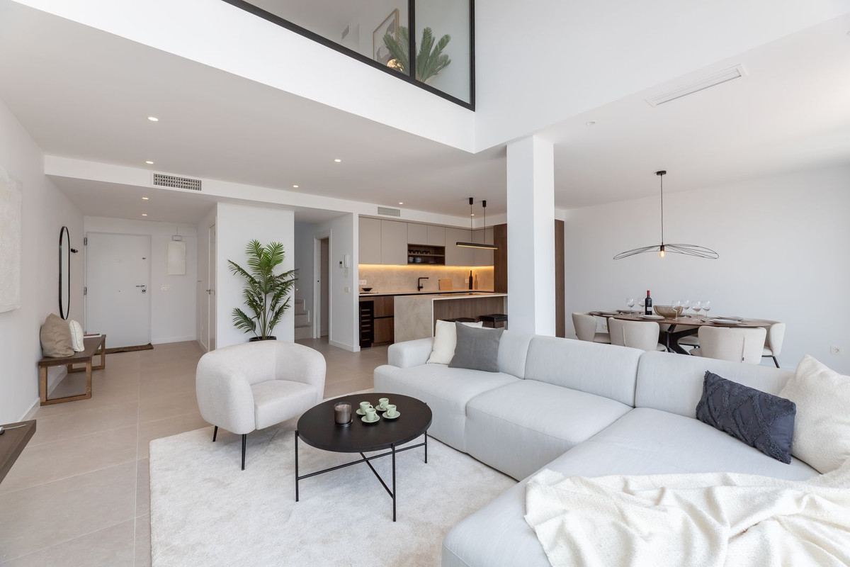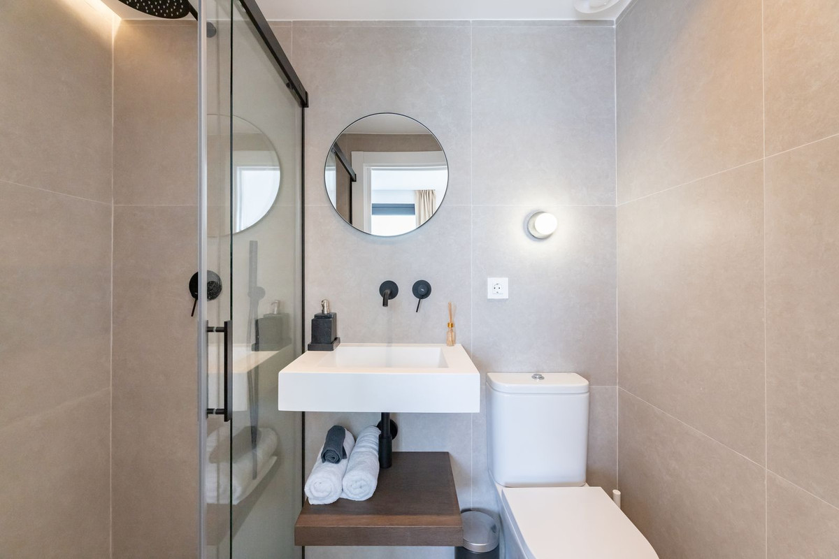This modern 3-bedroom townhouse is bright and spread over 2 floors. The ground floor features a modern open-plan layout with a fully equipped kitchen, a spacious living room, and a dining area. Large sliding doors lead out to a private terrace, complete with a barbecue station, outdoor dining area, and lounge seating—perfect for enjoying the Marbella lifestyle year-round. On the ground floor, there is a guest WC and also one en-suite bedroom/bathroom.