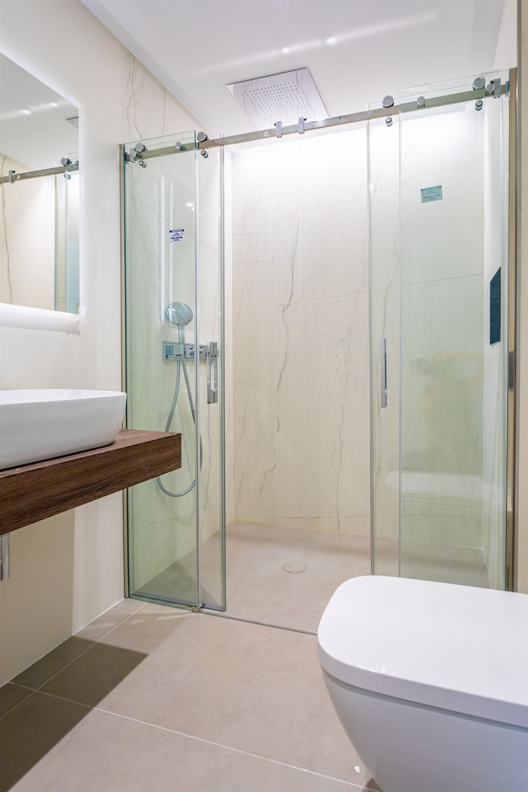 There are some luxury details to the apartment and top quality finishes. There are outdoor and indoor "raindance" shower heads. Bathrooms have anti humid and ledlights in the mirrors and underfloor heating