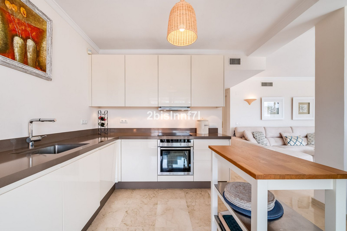 The apartment consists of two generously sized bedrooms and a third smaller one, ideal as a guest room, home office, or children's bedroom. Bedrooms benefits from lovely views of the landscape gardens. The two bathrooms have been renovated and feature underfloor heating for maximum comfort. The kitchen has also been completely renovated with high-end appliances and a modern design. One of the highlights of this property is its spectacular large terrace, with multiple areas to enjoy outdoor living. It features a covered dining space ideal for alfresco meals, a charming chill-out area and a sunbathing zone with longers, all offering beautiful views. Thanks to its excellent orientation, the apartment enjoys sunlight all day long, from 10 AM until sunset. From the terrace you can also enjoy a beautiful sea view on the horizon.