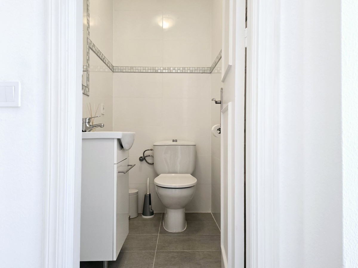 On the first floor, we find a spacious living room with a glazed terrace, making the most of this space and its natural light. On this level, you'll find a newly renovated guest toilet, a charming, recently installed kitchen, a convenient utility room, and a large, private, cosy rear patio.