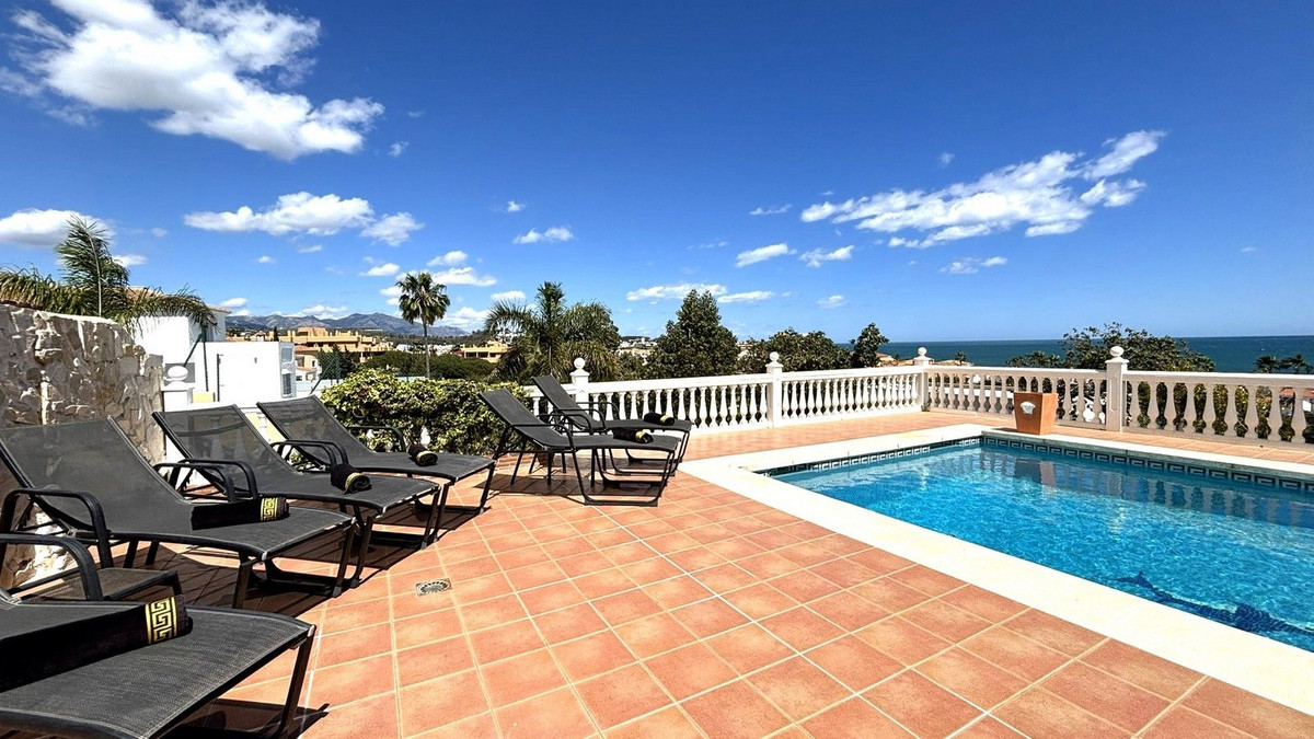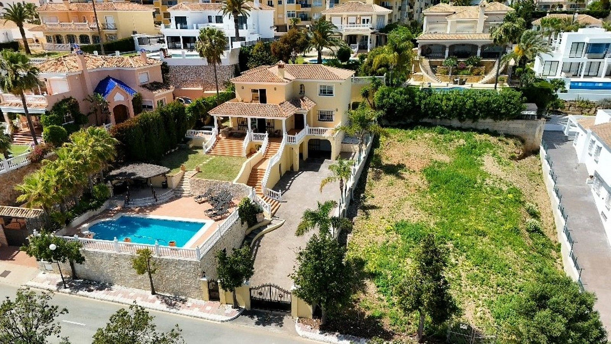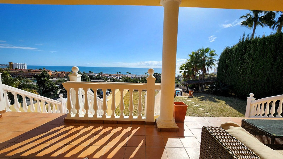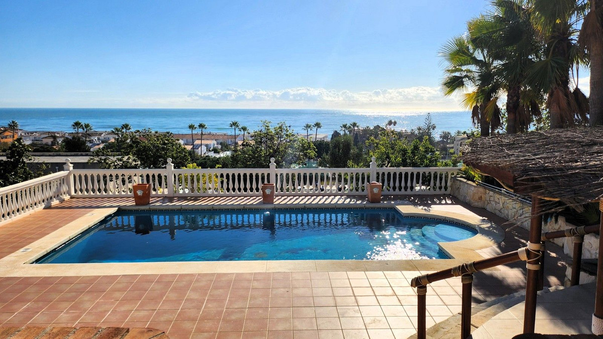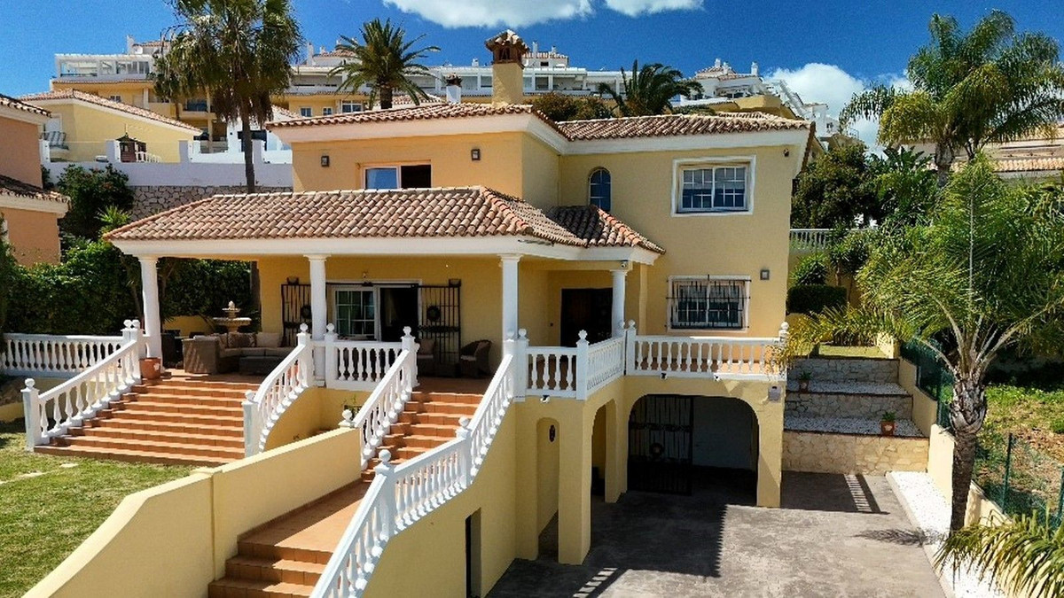 Experience panoramic sea views that will take your breath away! This stunning villa is just a short stroll to all the vibrant amenities and the pristine beach, offering some of the most breathtaking coastal vistas you've ever seen. Nestled in the coveted Jardin Botanico, just minutes from the heart of La Cala de Mijas, this property is a true gem. Set on a generous double plot, it provides ample space to truly live your dream. With five exquisite bedrooms, each boasting its own en suite, and a stylish guest toilet, comfort and elegance are at the forefront. The vast basement features a massive double bedroom, a lively games room, and a convenient shower room—a perfect retreat for family and friends. Up on the first floor, you'll find another charming bedroom, a stunning lounge graced by a colossal fireplace, and those extraordinary sea views that will forever inspire you. The sleek kitchen with access to the backyard makes everyday living a pleasure. Ascend the grand staircase to discover three additional en suite bedrooms, including the master retreat with its own private terrace—an oasis of peace and luxury. If you’re seeking a remarkable investment or a place to call home that stirs your soul, this property is calling out to you. Don’t miss the chance to make this enchanting haven yours!