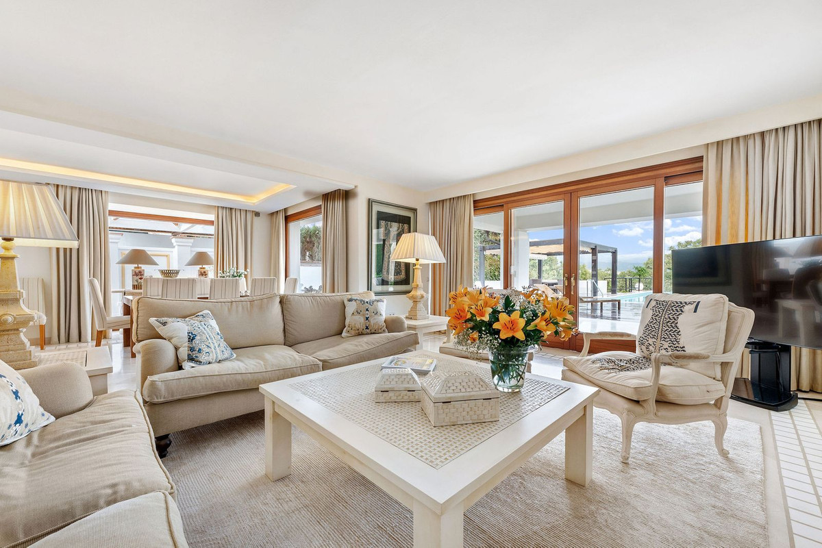 Rare opportunity to aquire a classic villa in perfect condition frontline to Royal Las Brisas Golf. As you enter you immediately feel that the house was built to very high standards where details and personal touches can be seen throughout. The main floor comprises of the open plan kitchen, dining area and livingroom all with access to the terrace area where you have amazing views over the 15 meter long heated infinity pool towards La Concha. On the same floor you have 2 bedrooms ( orginally 3), 2 bathrooms and a guest toilet. The first floor occupies the Master Suite with a beautiful private terrace enjoying the grand views. There is also direct access from the property onto Las Brisas Golf. The house has a large garage and carport . In he basement area you have a custom built bodega with room for hundreds of bottles, a laundry room and a storage which could be turned into a games room etc. This is a special property in a priviliged location that has to be seen to be fully appreciated **PLEASE NOT THAT THIS WAS ORIGINALLY A 4 BEDROOM HOUSE AND CAN EASILY BE CONVERTED BACK**