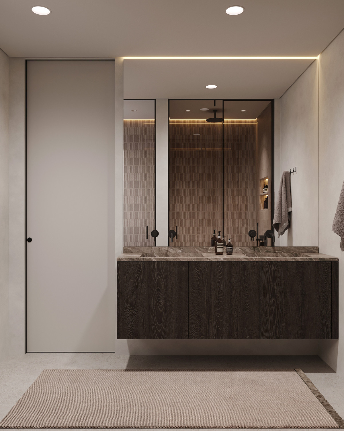 On the ground floor, you will find an elegant open-plan layout that combines the living room with a sleek modern kitchen and a stylish dining area. Large sliding doors lead you to the spectacular outdoor space, where a private pool and a beautifully curated garden await—perfect for entertaining guests or enjoying quiet relaxation. One en-suite bedroom is conveniently located on this level, ideal for guests or family members.