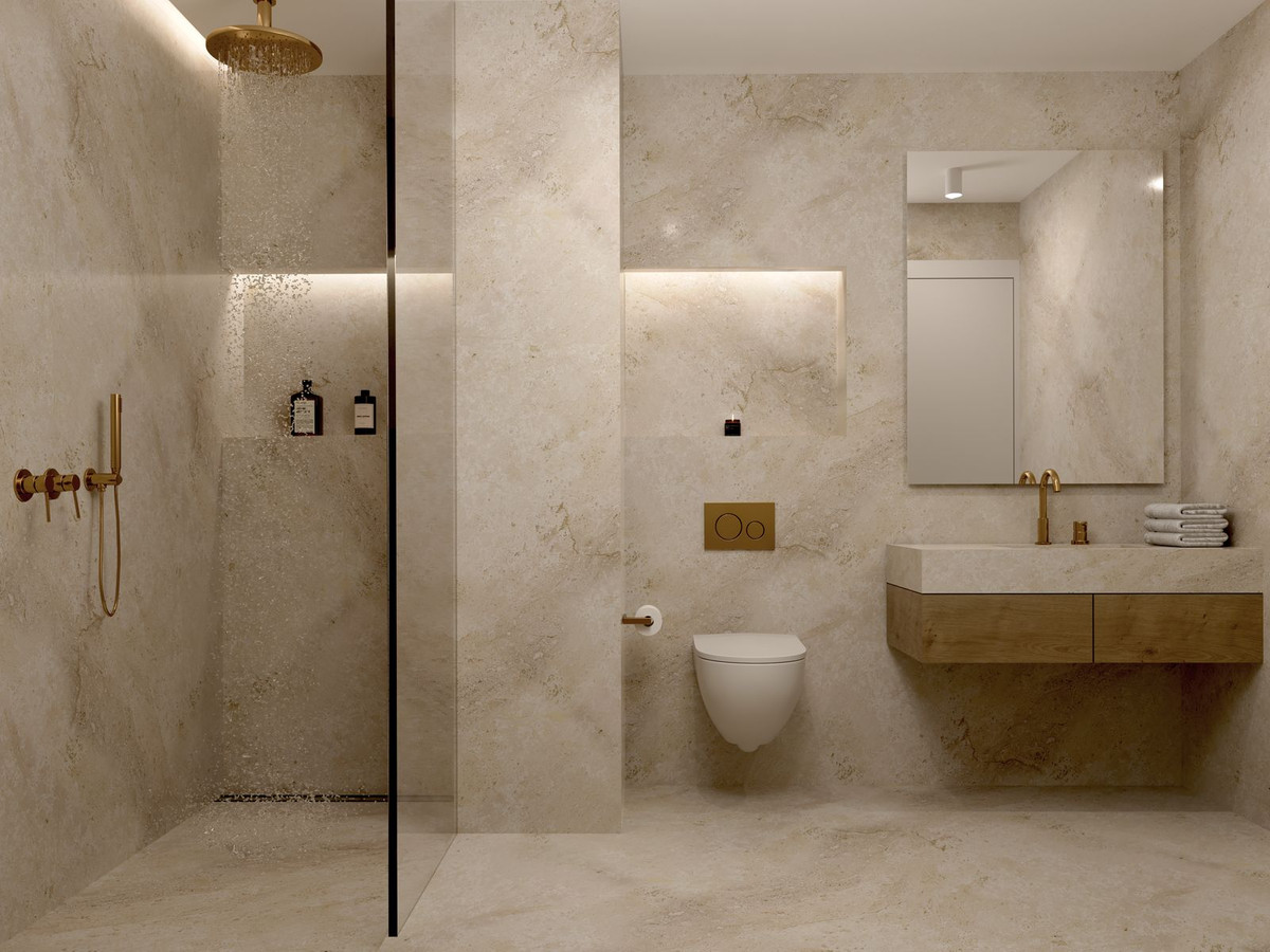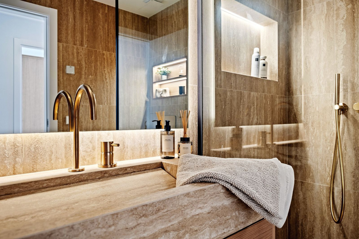 Two spacious bedrooms and two luxuriously appointed bathrooms, both featuring rain showers, floating vanities, and suspended toilets