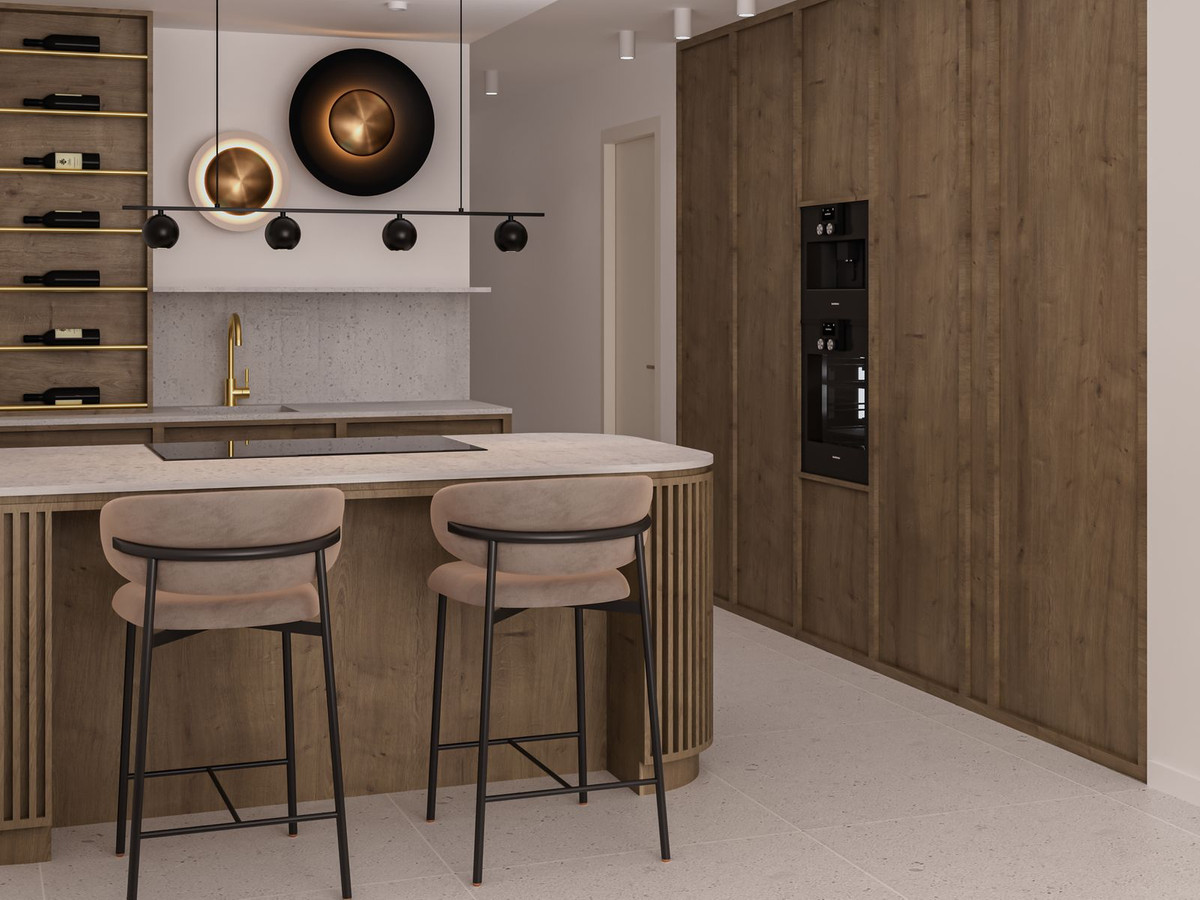 A fully customized designer kitchen with rounded-edge carpentry, indirect LED lighting, and a built-in open wine display — merging natural textures with contemporary function