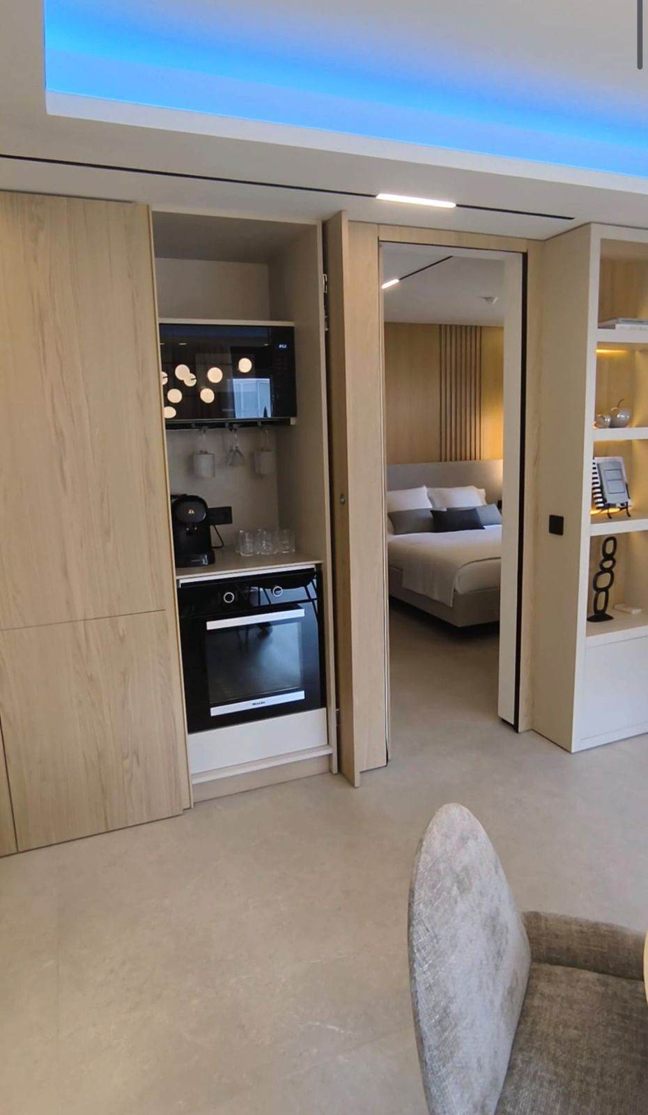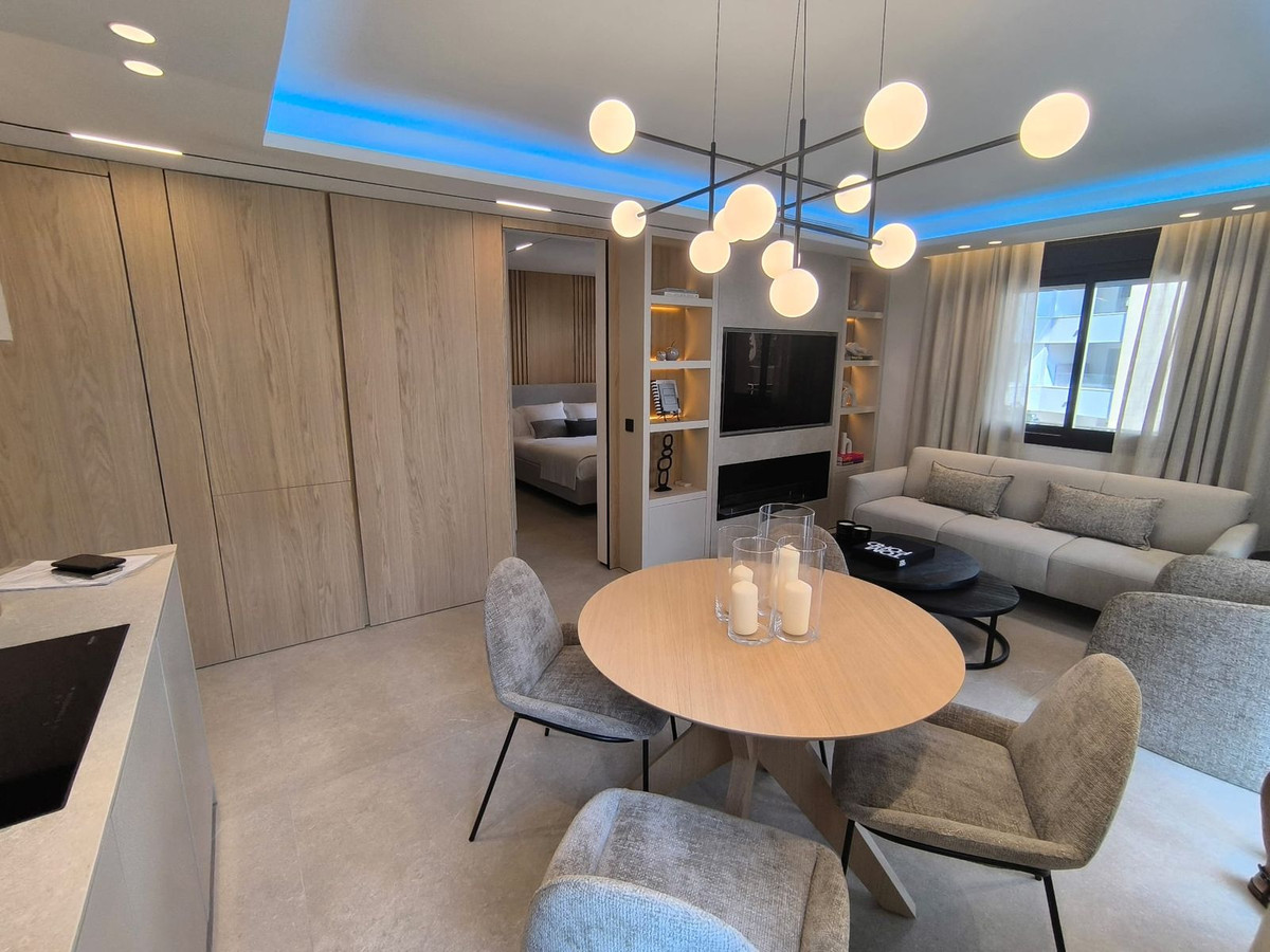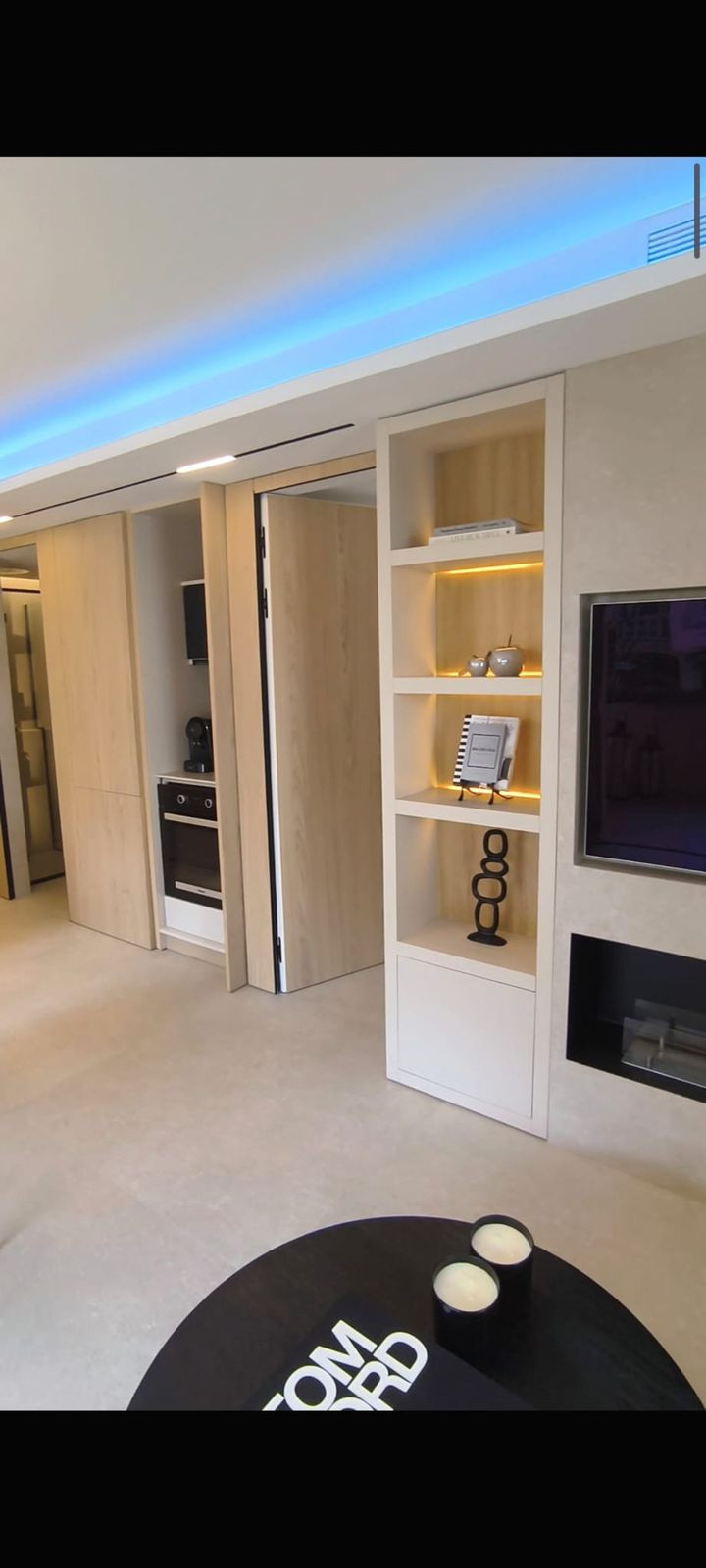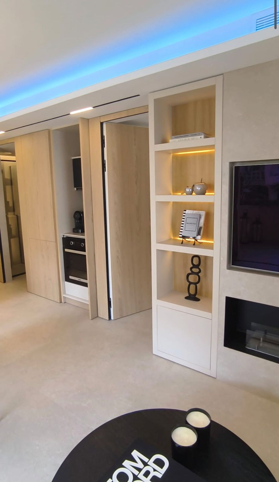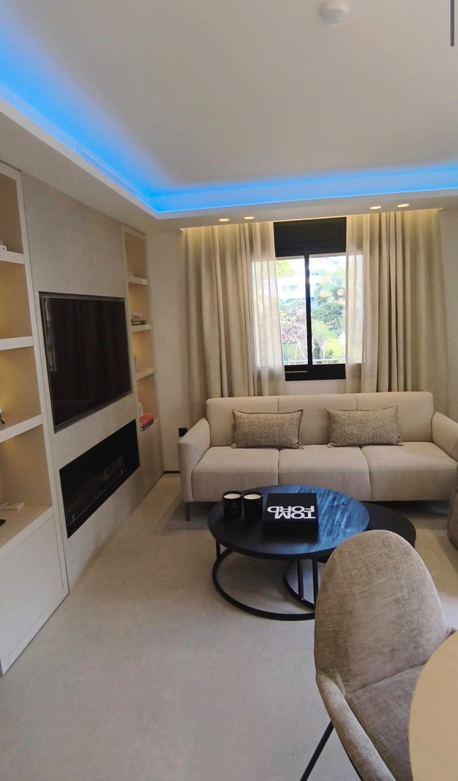 Modern apartment with 2 bedrooms and 2 bathrooms located in the best area of Puerto Banus. Large entrance hall that leads to the different areas of the apartment. Fully equipped and furnished independent kitchen with integrated breakfast area hidden in the wood paneling. Top quality materials from the Logos brand. Miele brand appliances, with integrated ceramic hob in the countertop. Bright living room with bioethanol fireplace with integrated LG TV and access to open terrace with views.