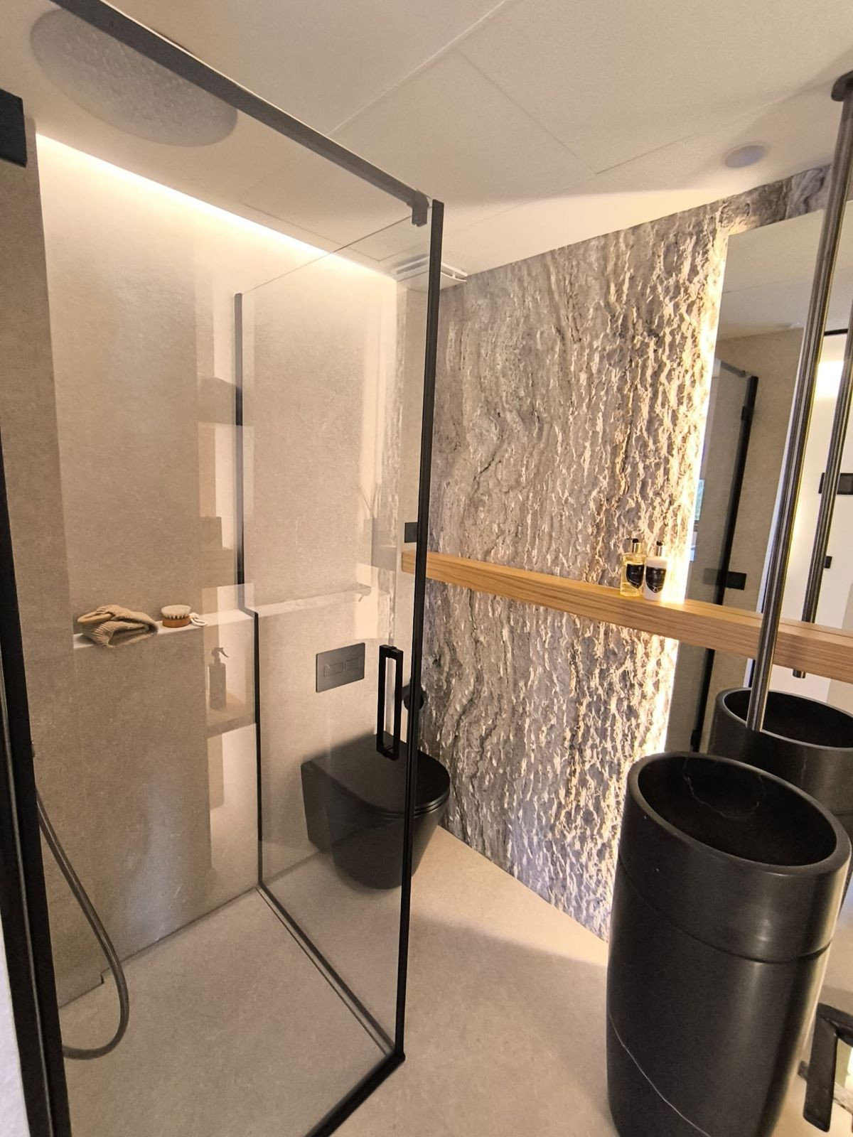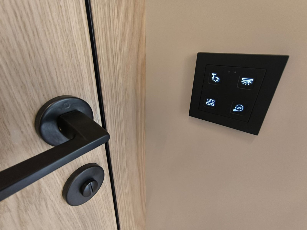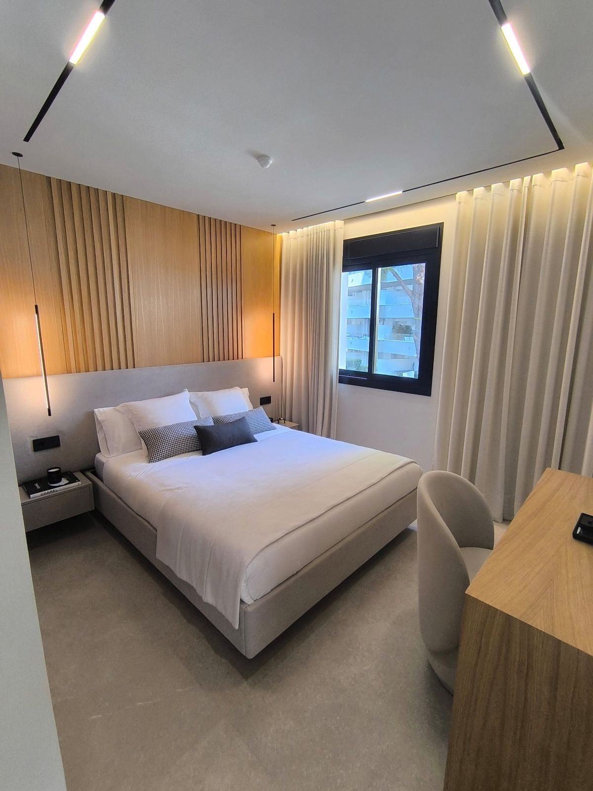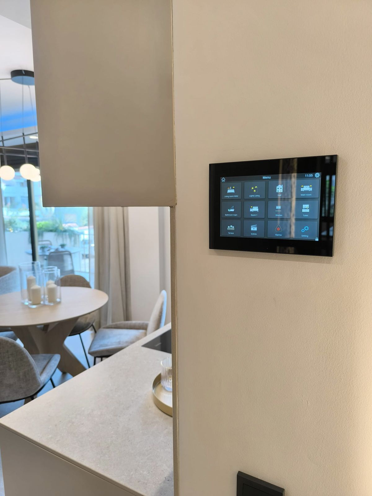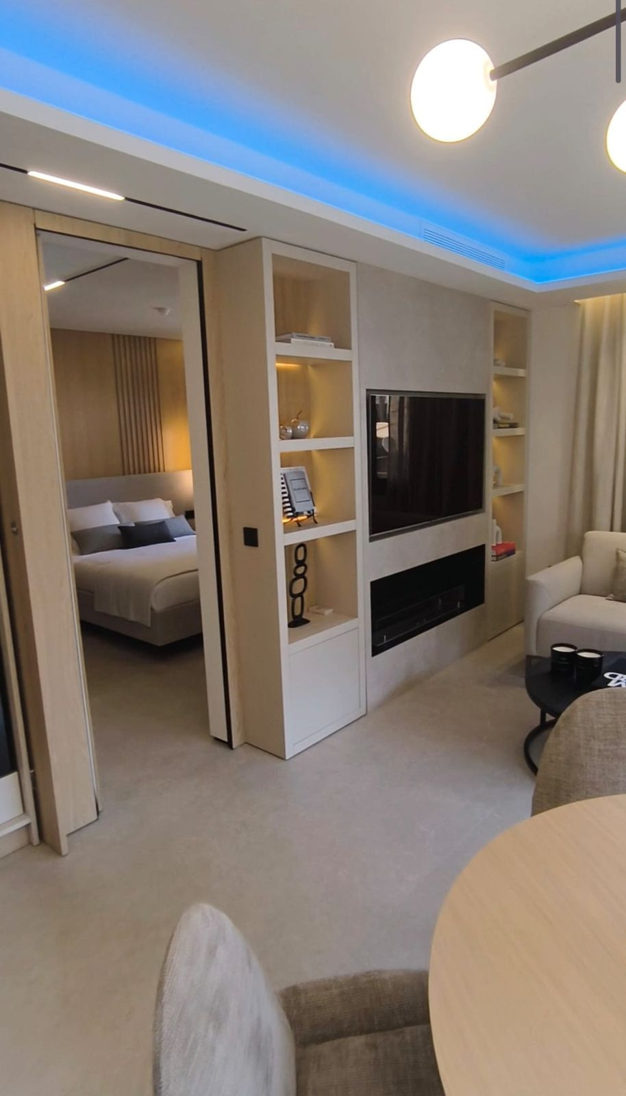 Master bedroom suite with dressing room and private bathroom. Both bedrooms have LG televisions. Comprehensive home automation control from the Zennio brand.