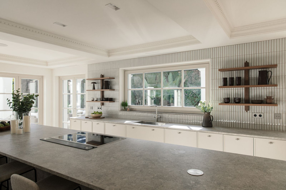 At the heart of the home is a beautifully tailored kitchen, marrying functionality with high-end design. The open-plan living and dining area is a masterclass in contemporary interior design, featuring curated furnishings, a soothing neutral palette, and warm wooden details. High ceilings and direct access to the terrace enhance the indoor-outdoor flow, infusing the space with natural light and an airy ambiance.
