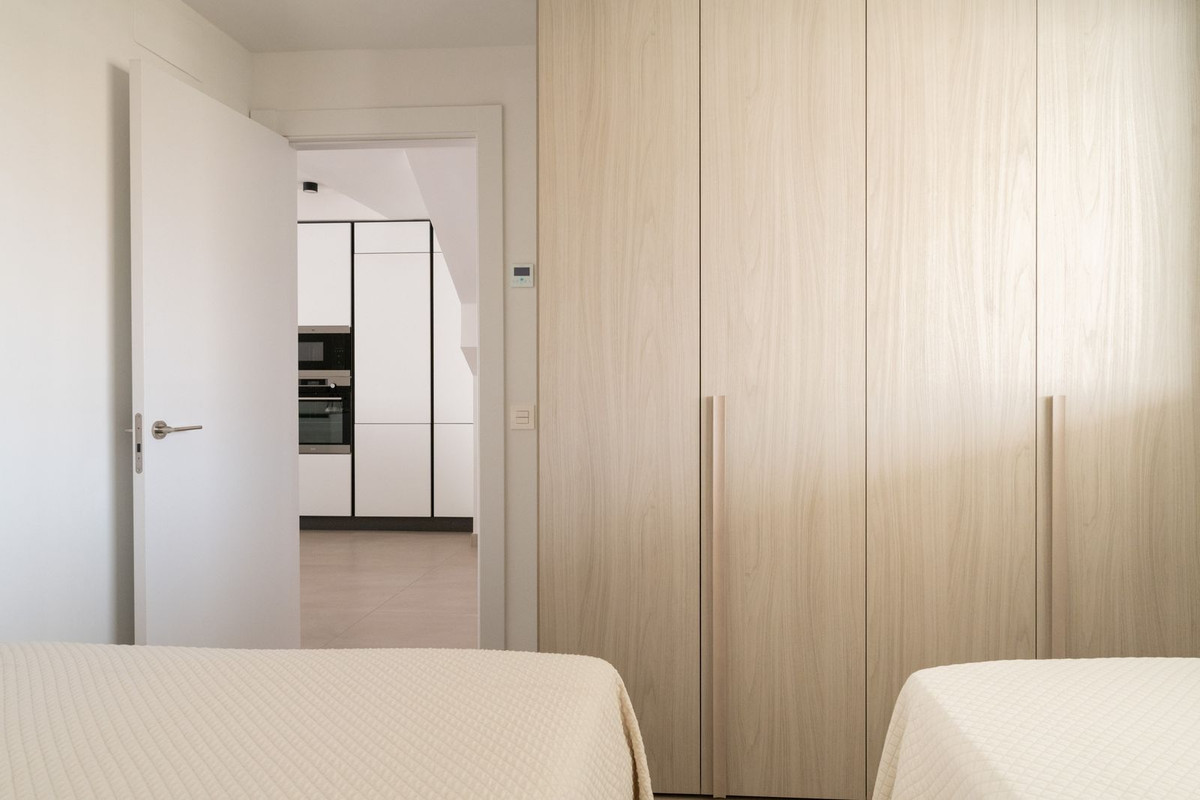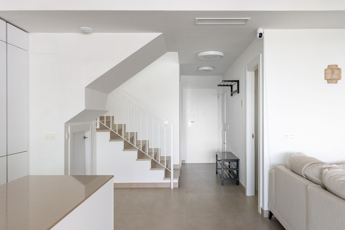 The duplex comprises three double bedrooms, including a master suite with a walk-in wardrobe and en-suite bathroom, three full bathrooms, a spacious open-concept living-dining room of more than 35 m² with a brand-new fully equipped kitchen, an independent laundry room, a private storage room, and an internal staircase.