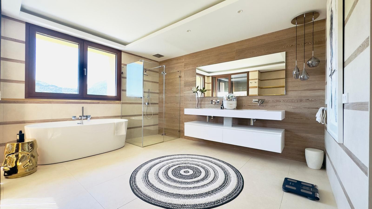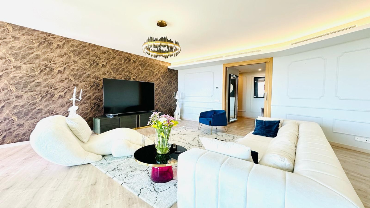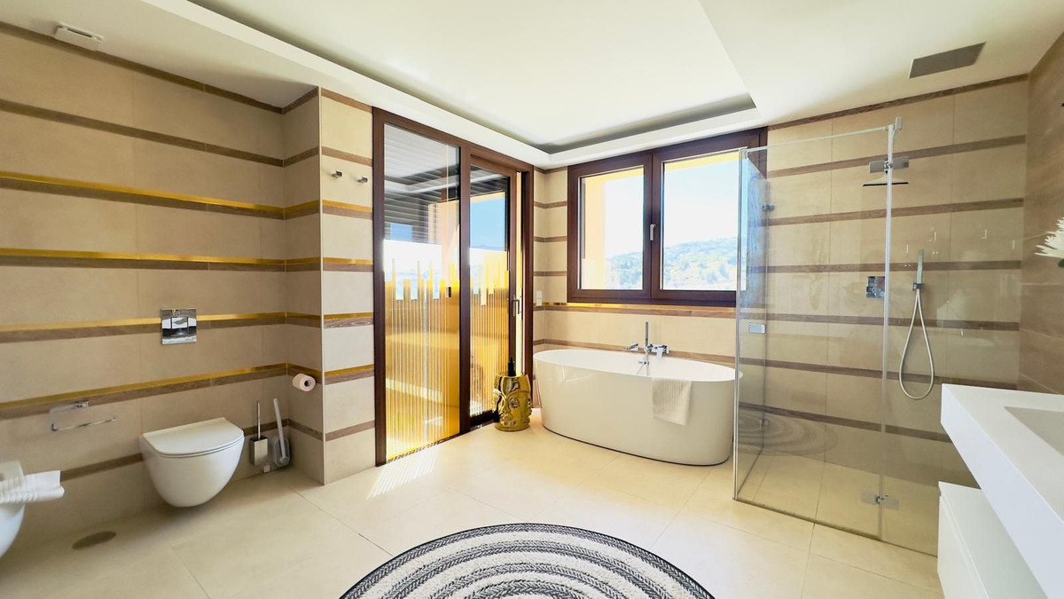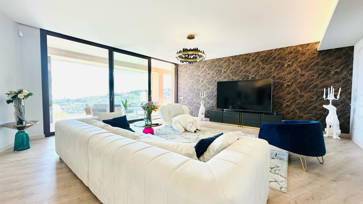The highlight is the expansive balcony with breathtaking panoramic views of the mountains, golf course, and sea. Designed for outdoor living, it includes a BBQ area, sun loungers for tanning, and space for children to play safely in the open air.