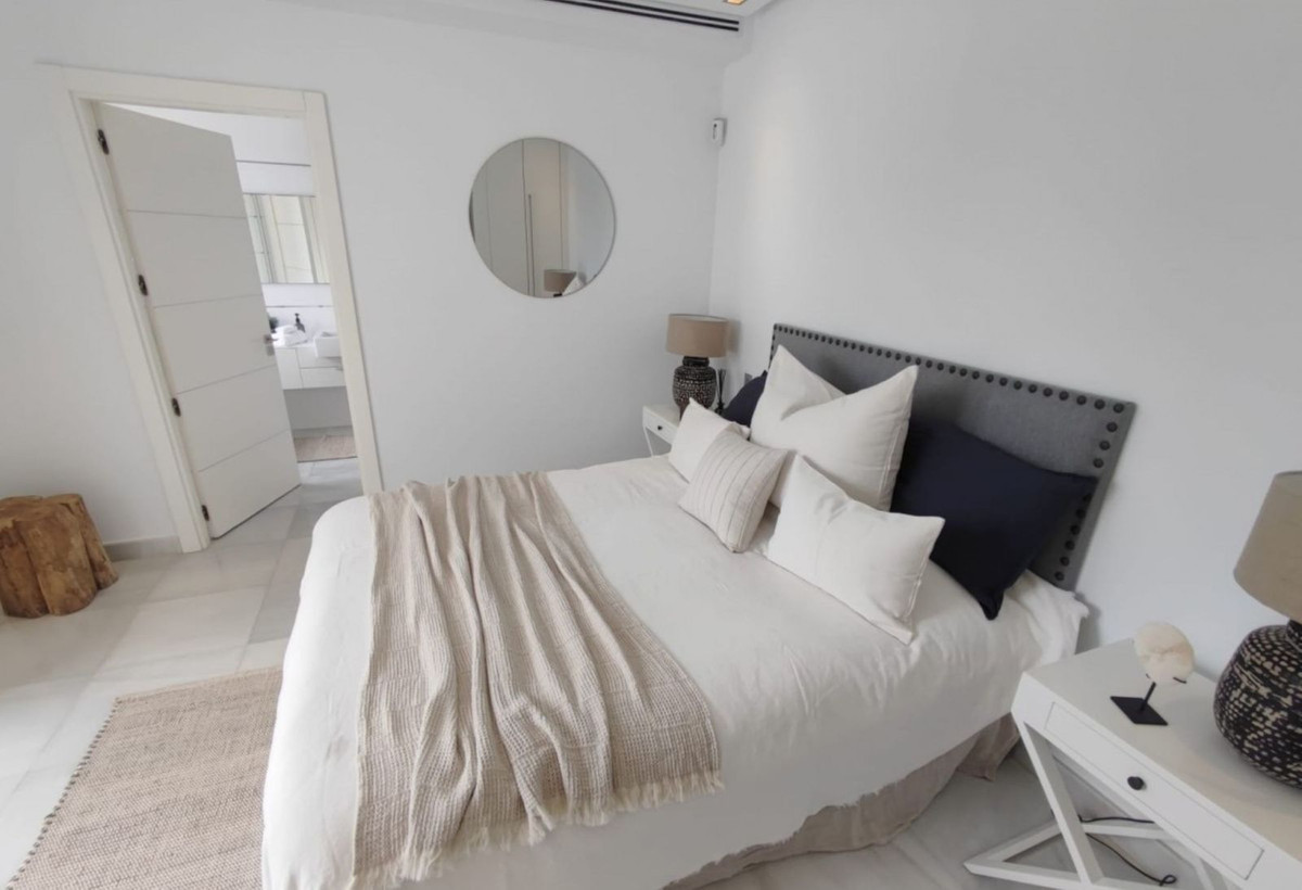 A stunning contemporary five-bedroom villa recently renovated, located just a few minutes’ walk from Central Plaza and Puerto Banús. The entrance and gardens feature a serene Japanese-style water feature, leading into an open-plan foyer with a spacious reception area thoughtfully divided into a TV lounge, dining space, and a double-sided fireplace, with a private office behind a glass partition. The newly renovated kitchen is fully equipped with all modern appliances.
