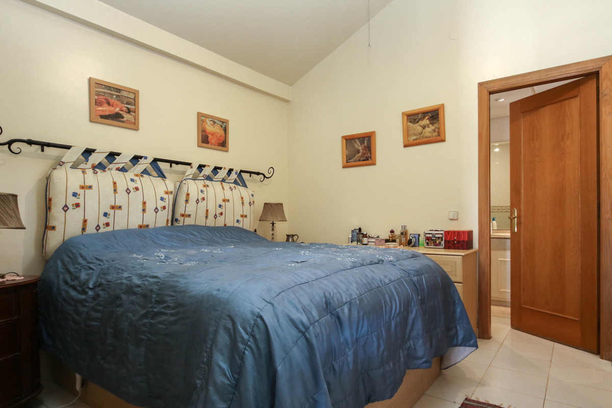 The master bedroom also opens onto the terrace and includes a well-sized en-suite bathroom with a corner bathtub.