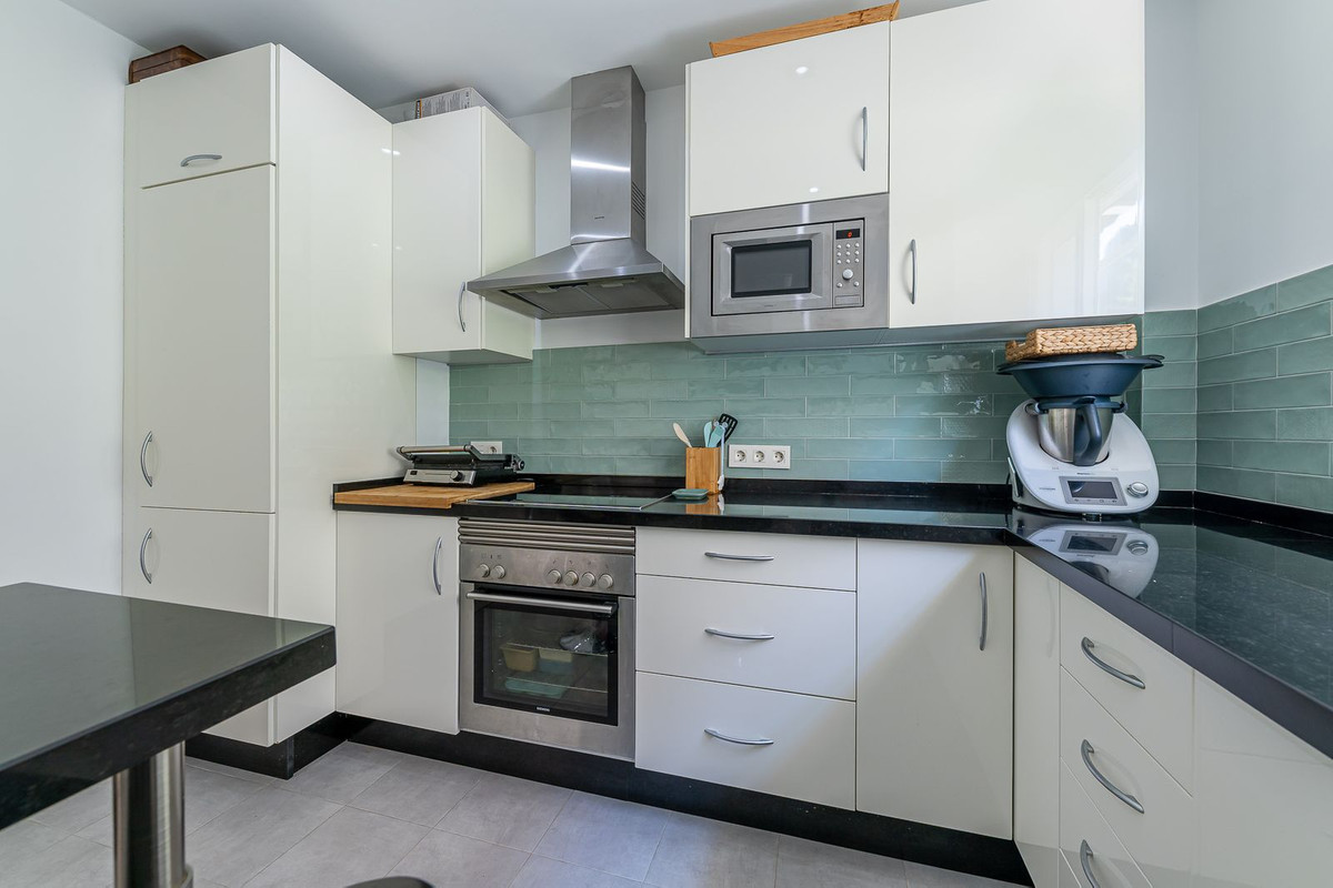 On the main floor, you’ll find a fully equipped independent kitchen with a separate laundry area, and a large living-dining room with direct access to a 25 m² terrace, partially enclosed with LUMON glass curtains. From here, you can enjoy open views of green areas and the communal pools.
