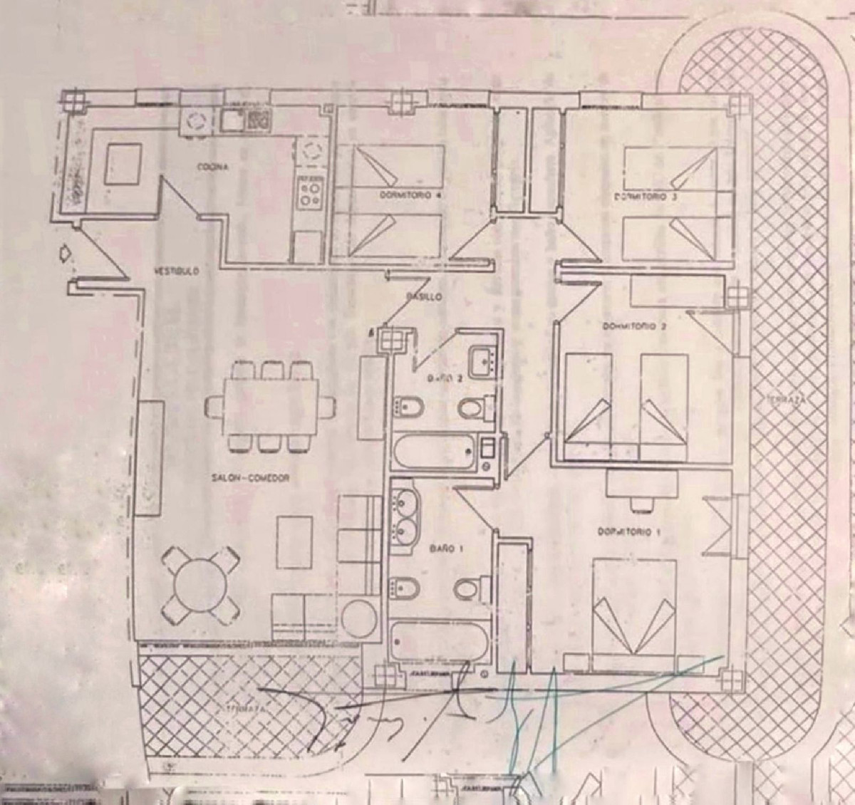 Greek marble flooring in the main areas, terrace, and primary bathroom; high-quality ceramic stoneware in secondary bathrooms and kitchen.