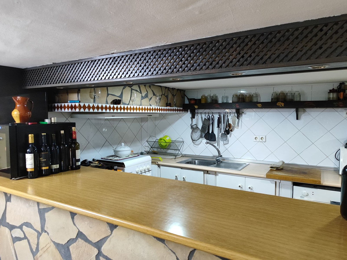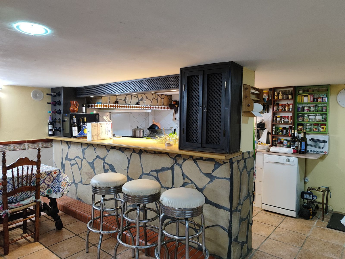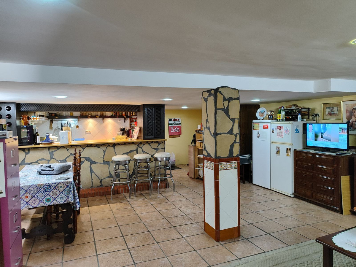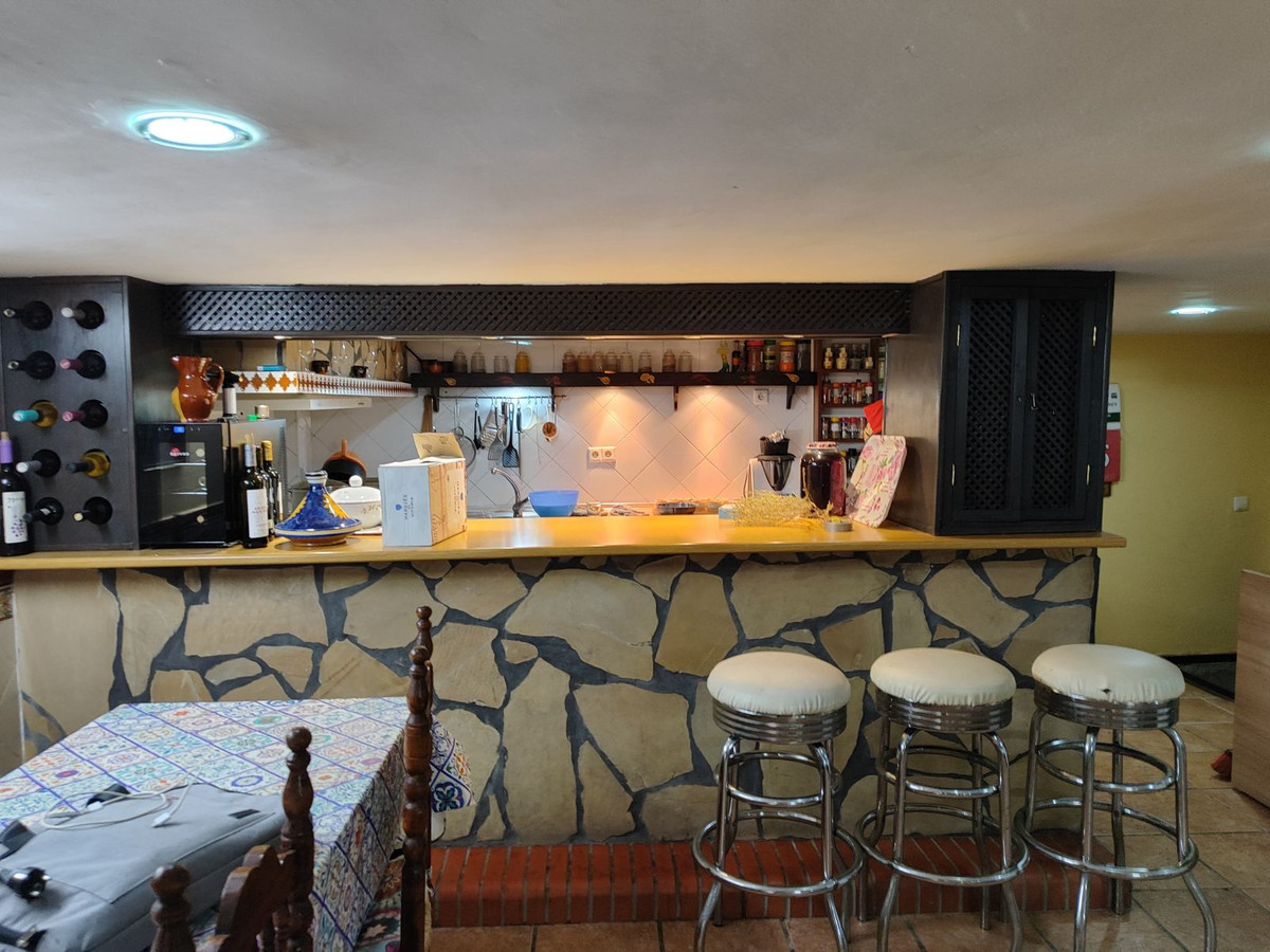 Garage for car and motorbike, bathroom, office, and lounge with fitted kitchen, bar, and stools.
