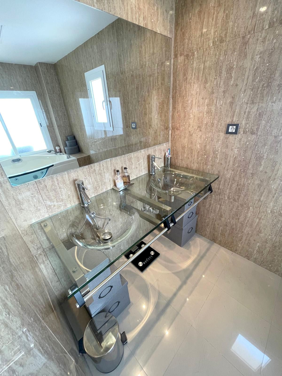 On the main level, you’ll find a bright and airy living and dining area, a second double bedroom, a modern kitchen, and direct access to a huge main terrace – a true highlight of the home. This expansive outdoor space features a jacuzzi, areas for sunbathing, dining, and entertaining, making it ideal for enjoying the Mediterranean lifestyle year-round.