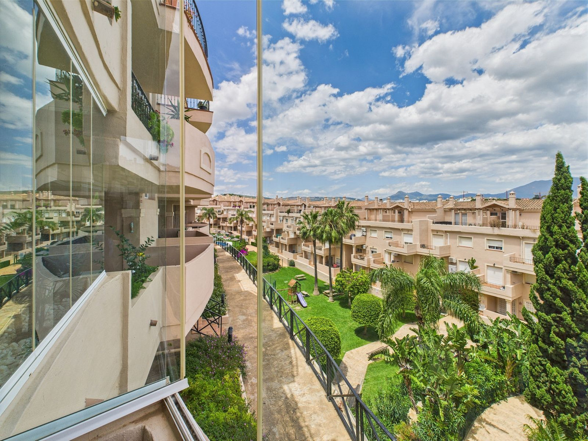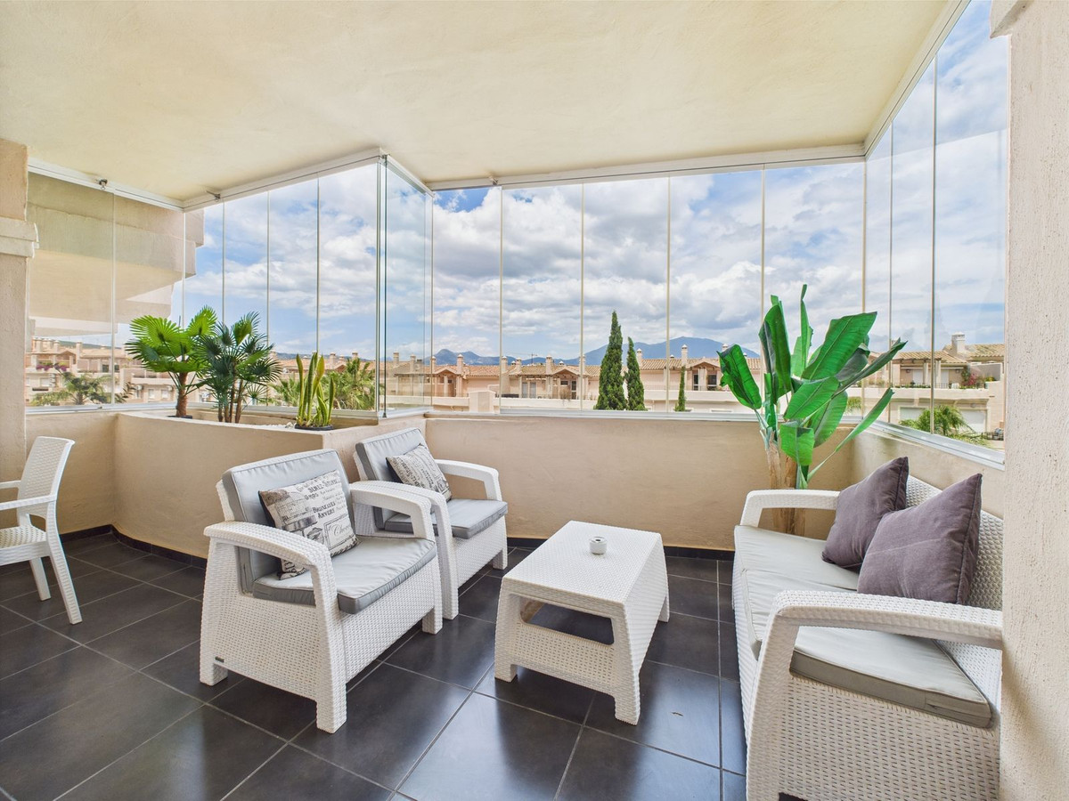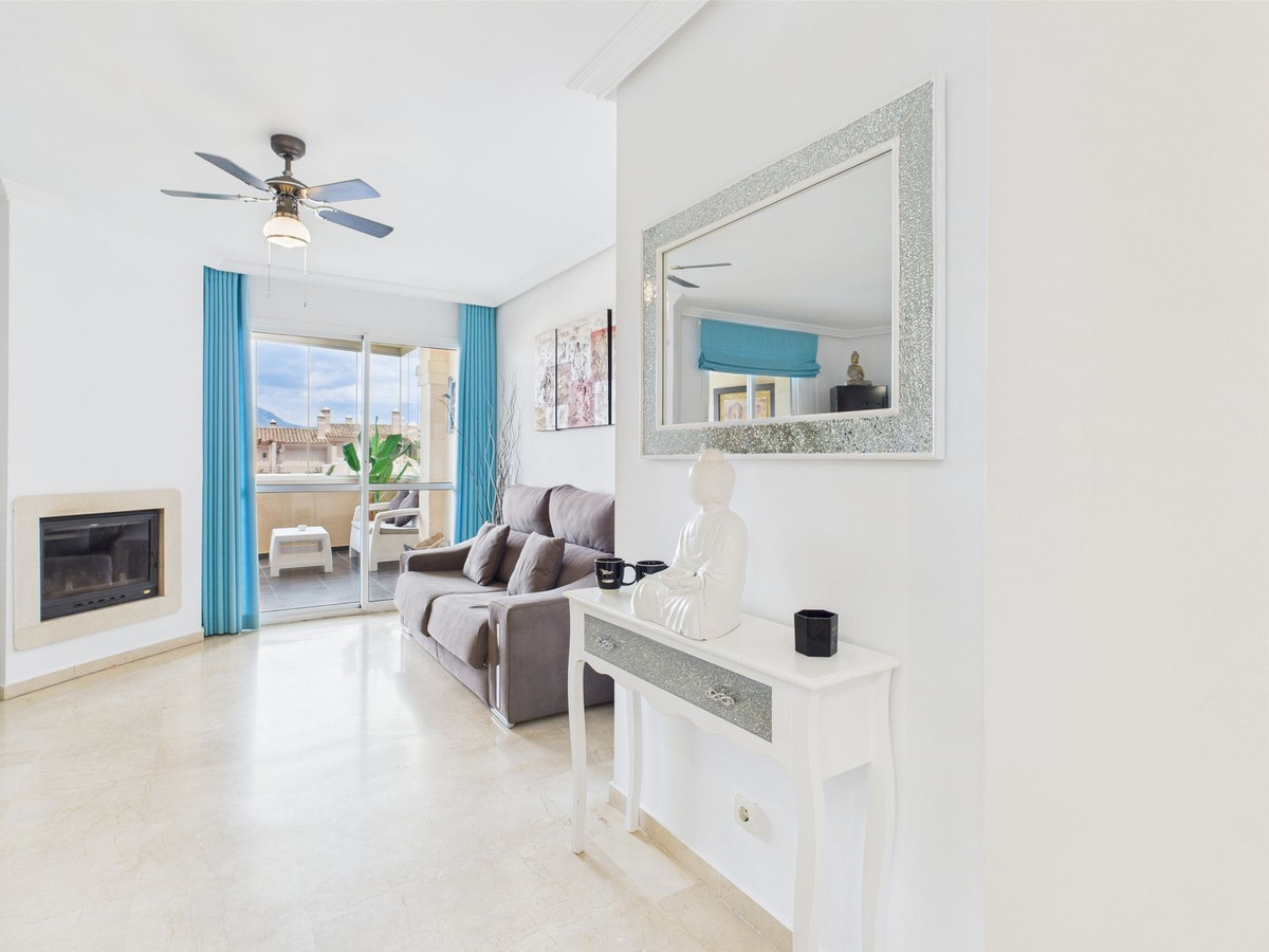 Discover refined coastal living in this fully refurbished 3-bedroom, 2-bathroom ground floor apartment, offering a harmonious blend of style, comfort, and prime location. Enjoy breath taking mountain views from two generous terraces, including a main terrace enclosed with glass curtains—perfect for relaxing or entertaining in any season while overlooking the pool and landscaped gardens.