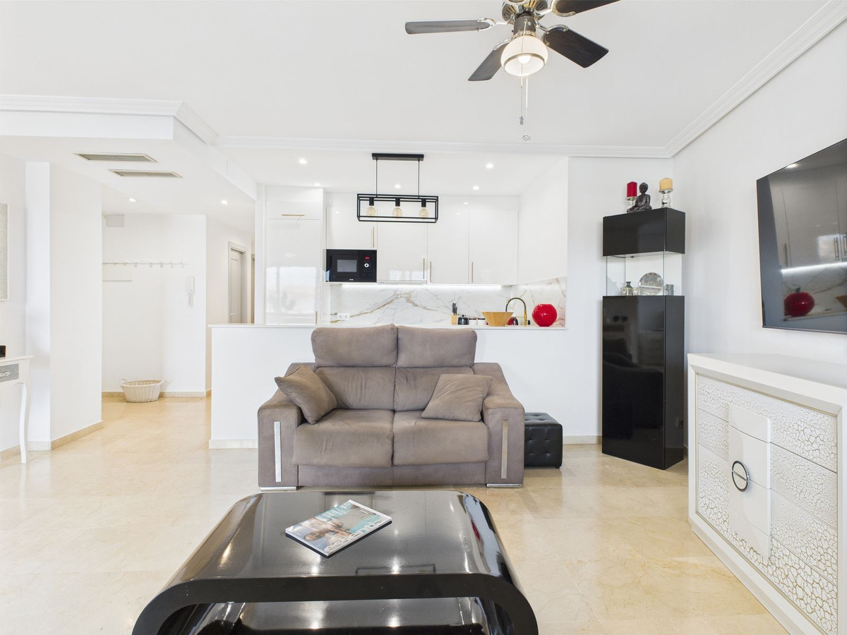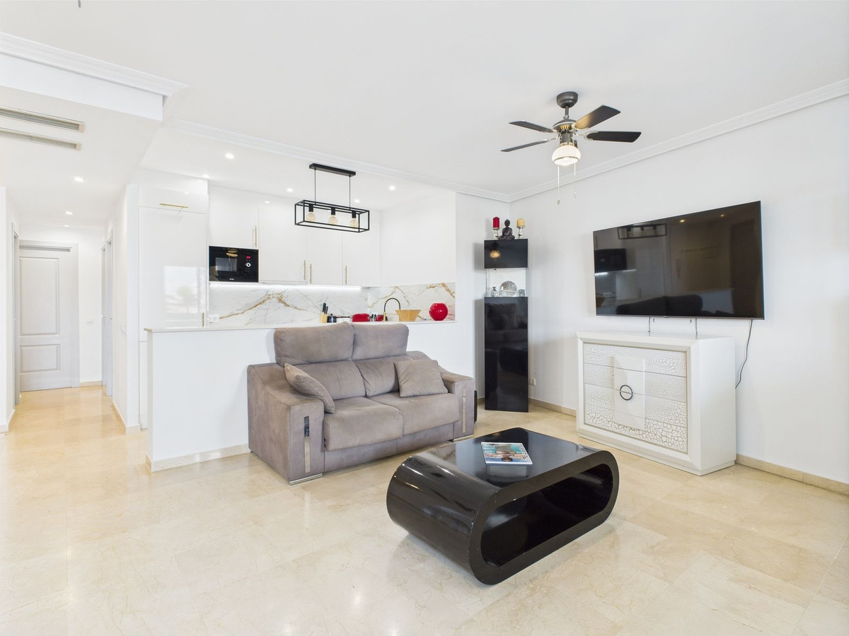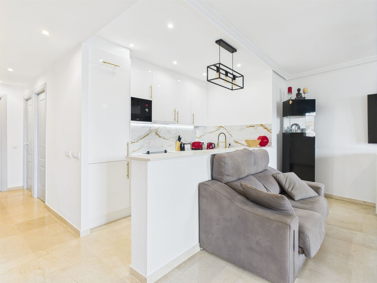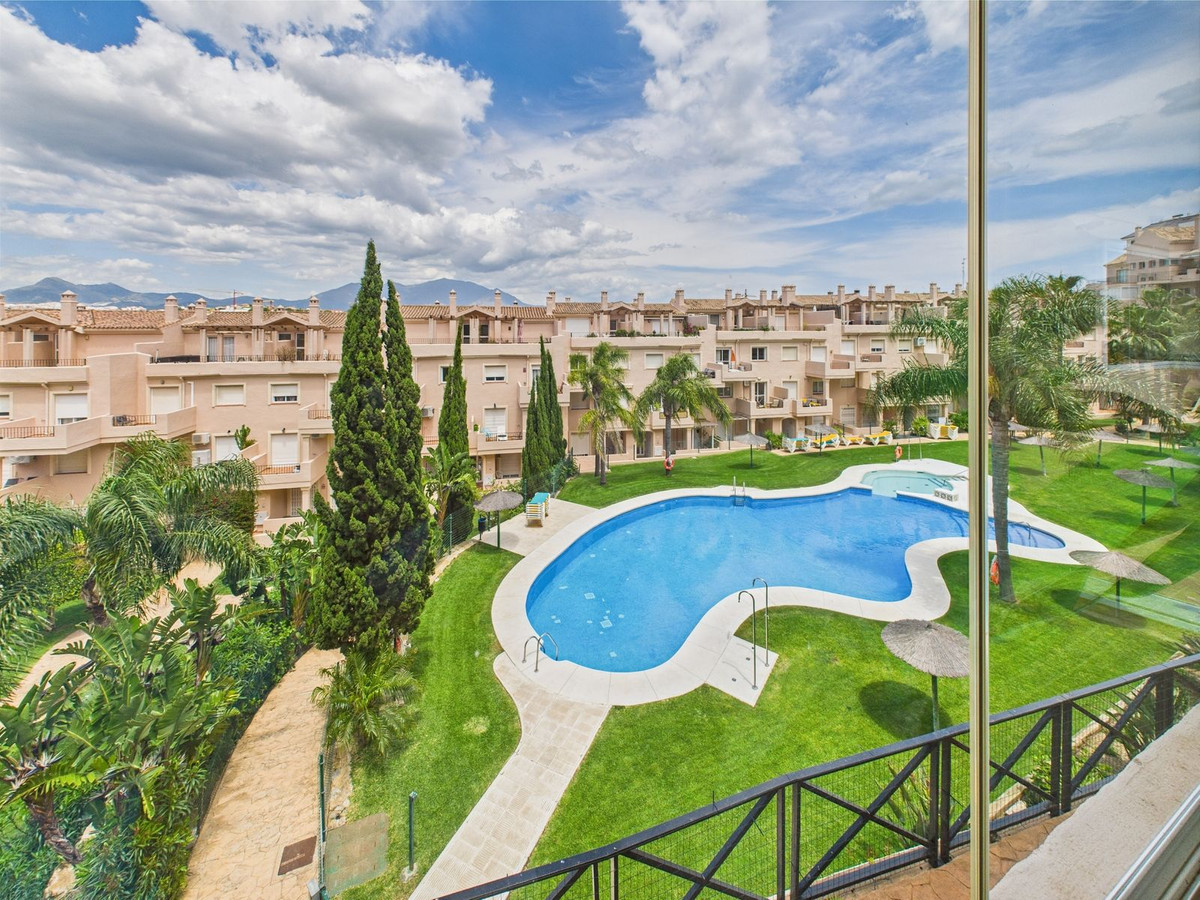 Discover refined coastal living in this fully refurbished 3-bedroom, 2-bathroom ground floor apartment, offering a harmonious blend of style, comfort, and prime location. Enjoy breath taking mountain views from two generous terraces, including a main terrace enclosed with glass curtains—perfect for relaxing or entertaining in any season while overlooking the pool and landscaped gardens.