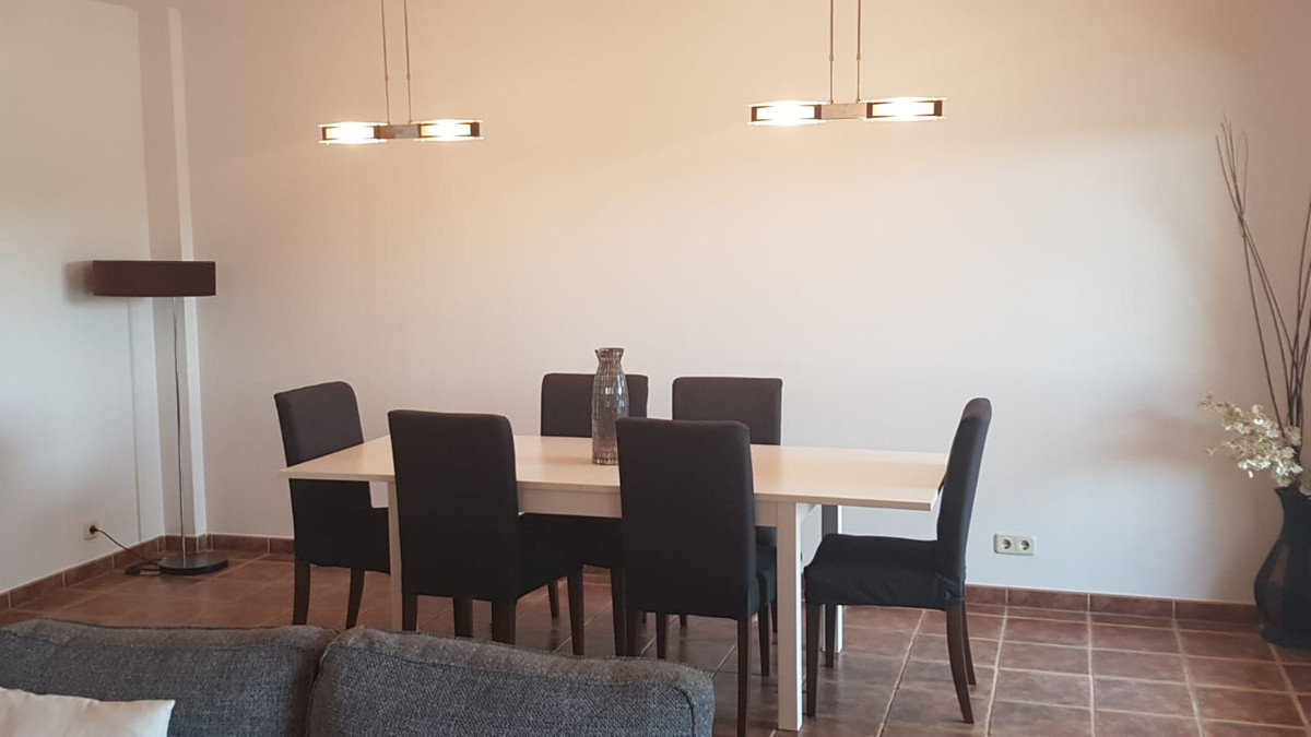 Spanning two spacious levels, the home features a bright and airy open-plan living and dining area, complemented by large windows and sliding doors that flood the space with natural light and open onto a private terrace—perfect for outdoor dining or relaxing in the Mediterranean sun. The fully equipped modern kitchen includes quality appliances, ample storage, and a breakfast bar for casual meals.