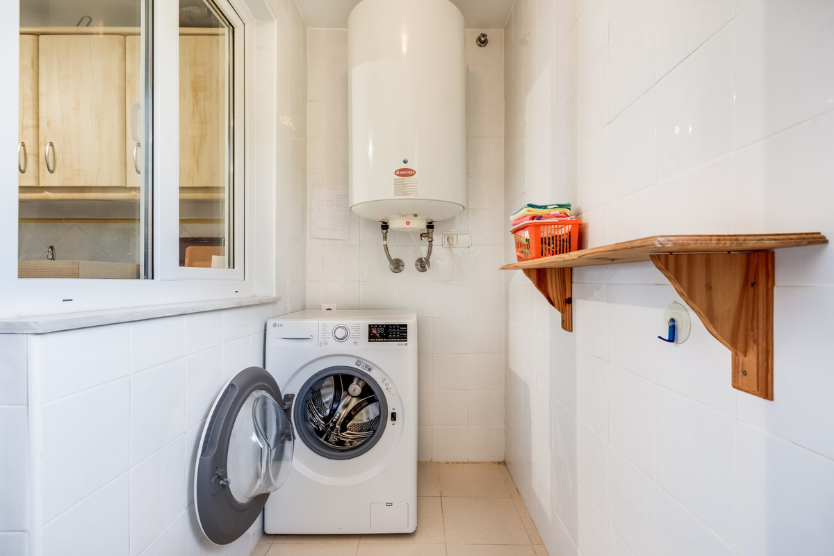 One of the two bathrooms is en suite, providing added privacy and functionality. The apartment features a generously sized original kitchen—ideal for those who appreciate traditional layouts—along with a separate laundry room equipped with a brand-new washing machine, as well a new AC unit with option for both hot and cold.