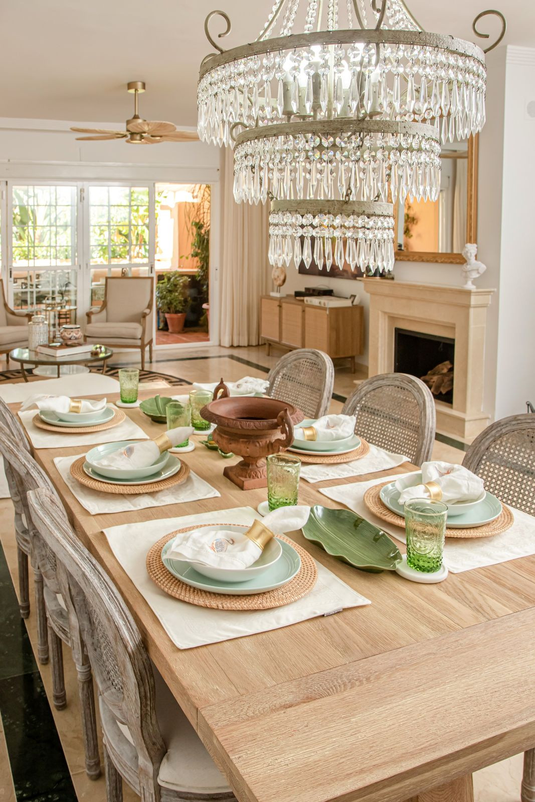 Ground floor: guest toilet, a bright living room with fireplace, fully fitted kitchen, and access to a charming private patio with a small pool, leading directly to the lush tropical communal garden with a large shared swimming pool.