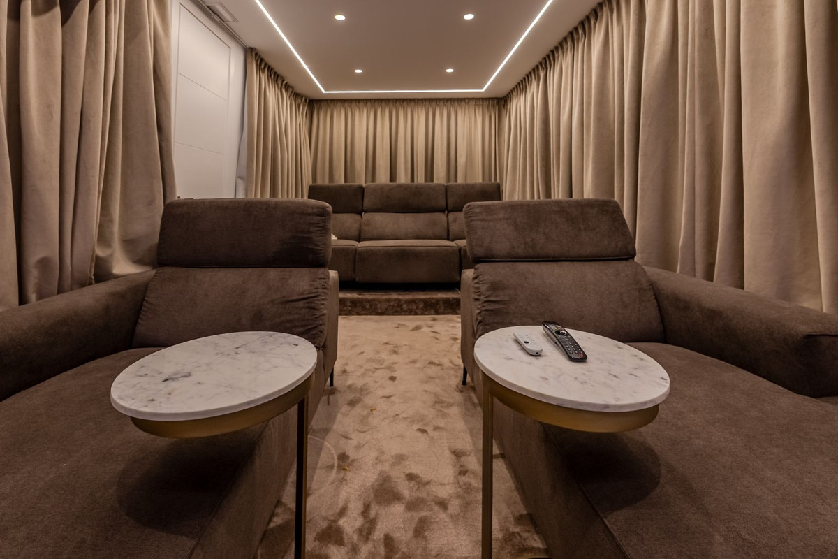 - The basement houses a large storage room, a fully equipped laundry room, a garage for two vehicles, a bathroom with shower and a comfortable mini-cinema room.
