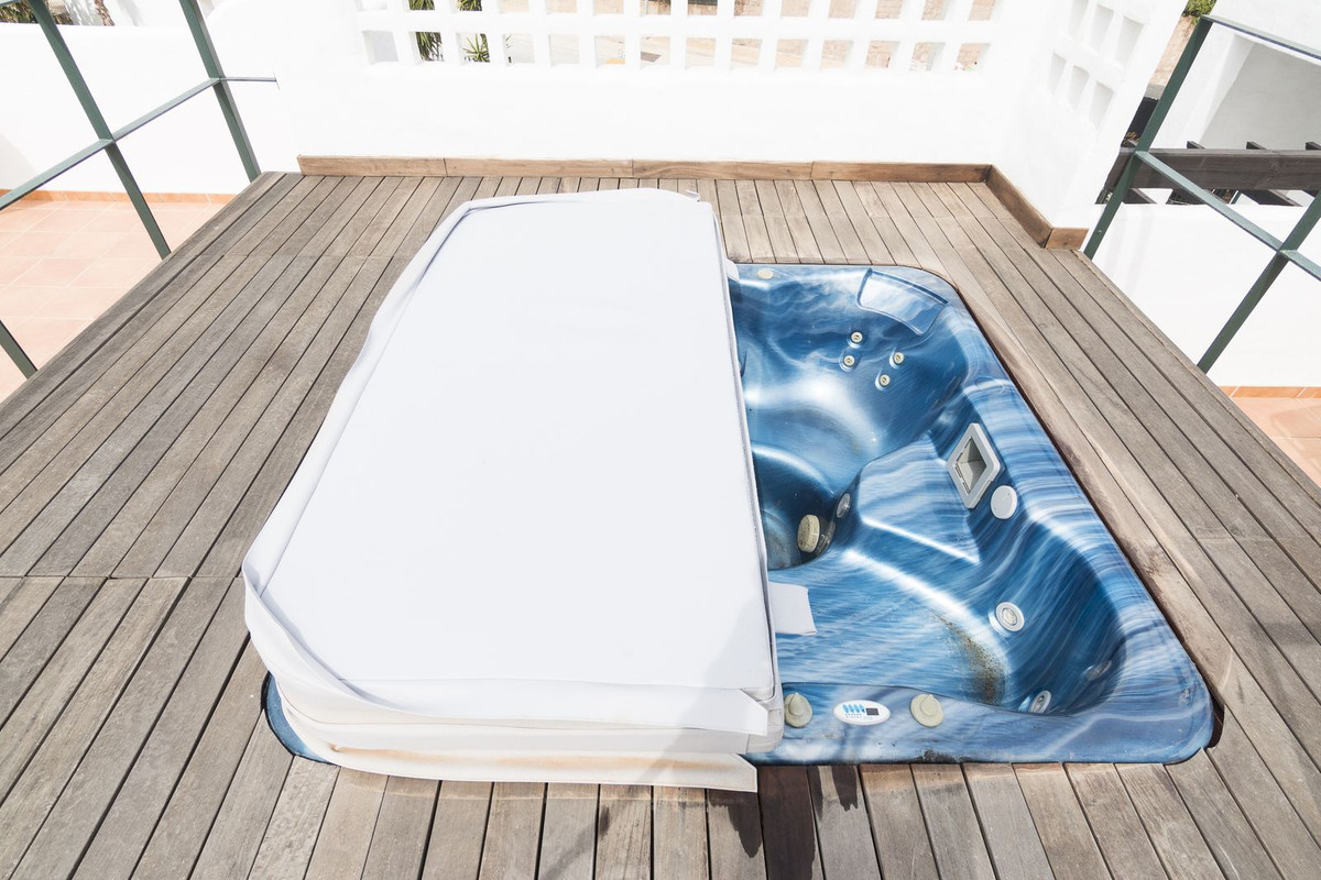 Located in a charming residential complex composed of 8 small three-story blocks, this exceptional penthouse offers a spacious living room, a fully fitted kitchen with a separate utility room, 3 bedrooms including a master suite with en-suite bathroom and direct access to the terrace, a second full bathroom, and a beautiful 47m² terrace leading to a 128m² solarium featuring a pergola and jacuzzi. From here, you'll enjoy stunning views of the golf course, the mountains, and the sea.