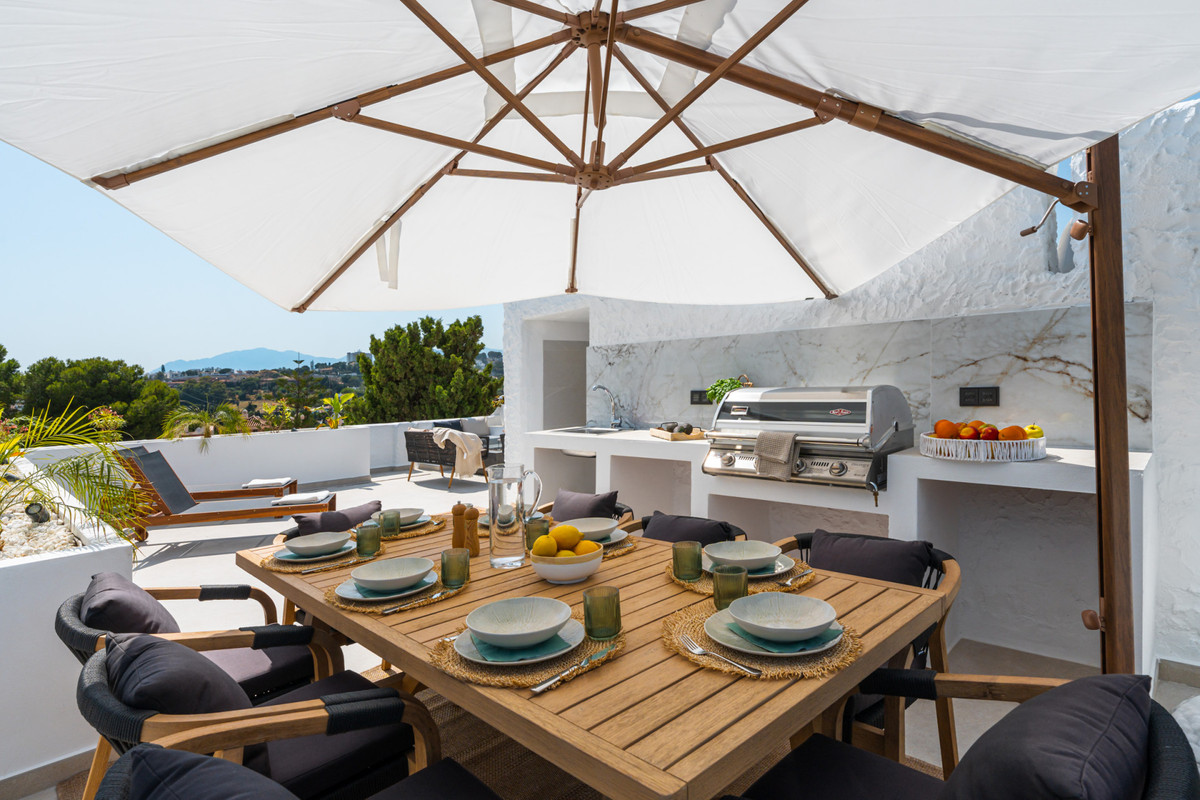 Penthouse La Arabesque offers a sophisticated take on contemporary living in the secure and stylish enclave of Atalaya de Río Verde, one of Nueva Andalucía’s most refined residential areas. This luxurious duplex penthouse for sale spans two spacious floors and presents a layout of three generous bedrooms and two sleek, modern bathrooms. With a built area of 172 square meters, it combines interior comfort with extensive outdoor living options, all designed to take full advantage of its privileged setting.
