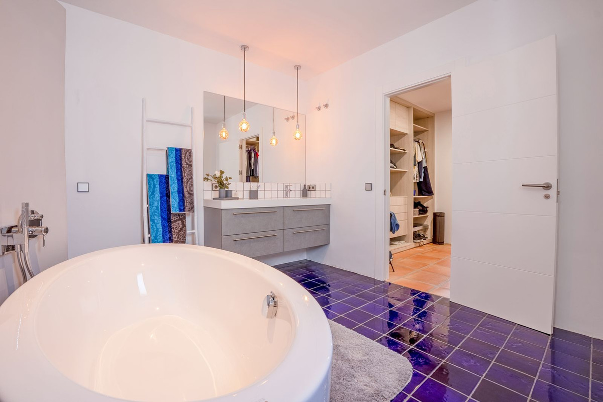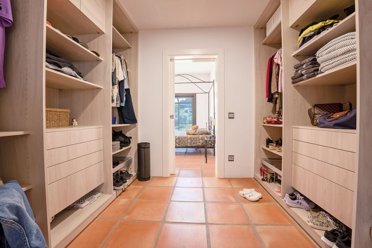 A luxurious master suite with walk-in wardrobe, ensuite with bath and shower, and floor-to-ceiling windows opening directly to the terrace
