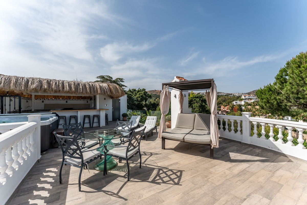 Stunning luxury villa located in the lower part of Calahonda, in an exclusive cul-de-sac surrounded by villas and in a very quiet residential area, just 800 meters from the beach, close to a beautiful natural green area of Calahonda, with breathtaking panoramic views of the sea and mountains. The property sits on a 715 m² plot and offers 232 m² of interior space plus a 70 m² terrace, fully enclosed, equipped with an alarm system and a private garage. The villa features four elegant bedrooms with king-size beds and en-suite bathrooms, marble floors throughout the house, double-glazed PVC windows and doors that provide exceptional natural light in every room. The furniture has been carefully selected and stands out for its sophisticated style and high quality. There are two dining areas — indoor and outdoor — perfect for entertaining. Outside, you’ll find a large heated swimming pool with wooden decking, sun loungers, a chill-out area, and open views that invite absolute relaxation. On the rooftop, the spacious solarium offers a fully equipped bar, barbecue area, jacuzzi, and bar stools — ideal for enjoying unforgettable sunsets by the sea. Additionally, the villa holds a tourist rental license and is successfully rented most of the year, making it an excellent investment with high rental potential. A unique property that combines luxury, comfort, and a privileged natural setting on the Costa del Sol.