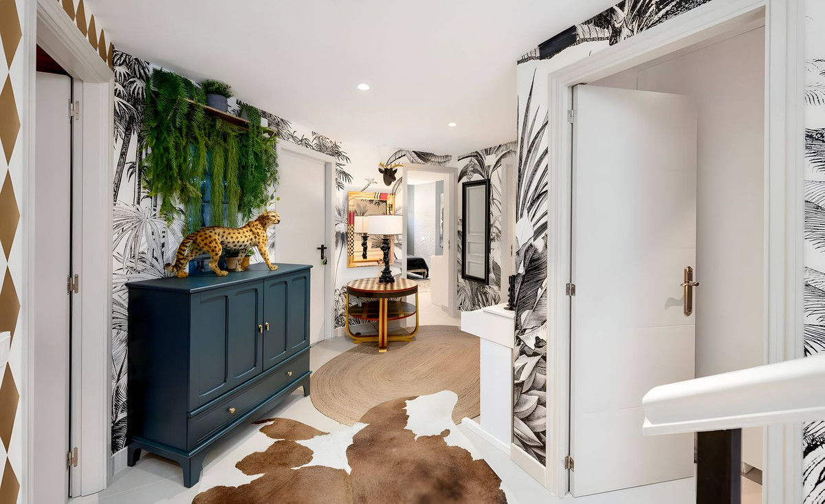 a unique interior design. This three-floor property offers an open-plan kitchen with Siemens