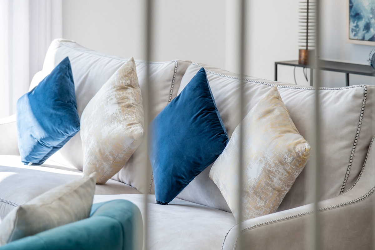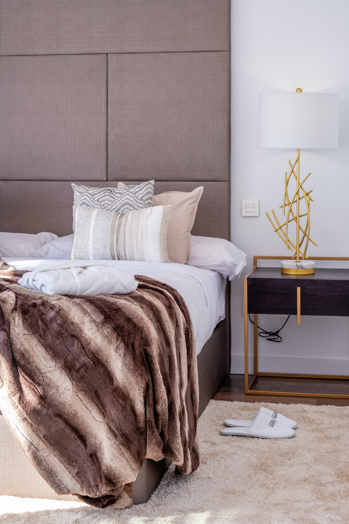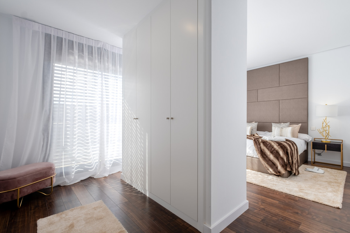 Designer flooring: warm walnut in the bedrooms, elegant beige tile in the living areas.