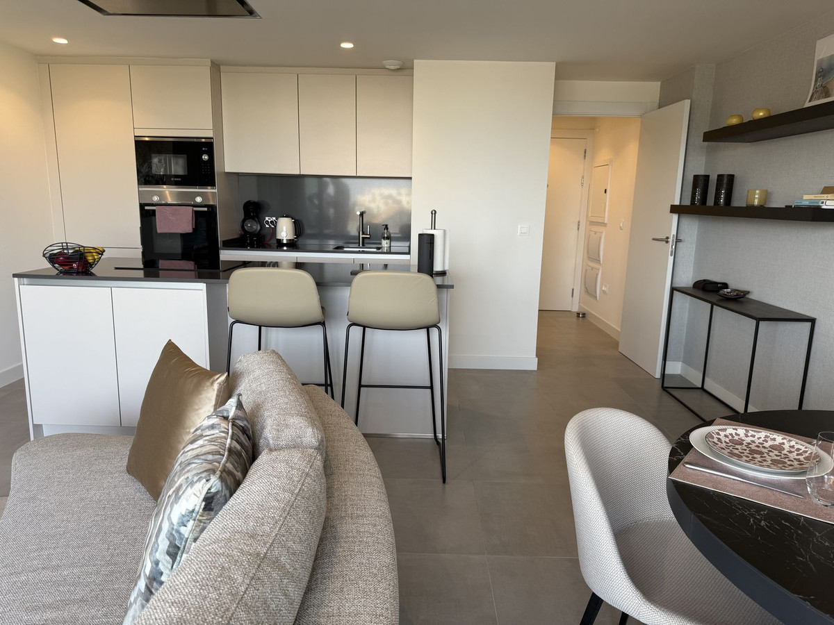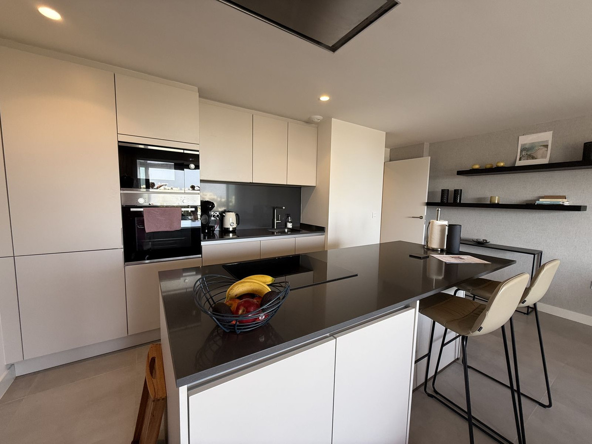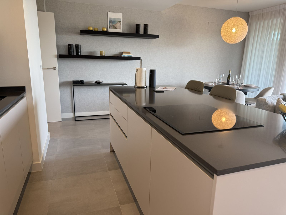 The interior living space of 102 m² flows naturally into a spacious 28 m² terrace that faces southwest, ensuring sun from late morning until sunset. The layout includes an open-plan living and dining area with large sliding doors that open directly onto the terrace. The fully equipped kitchen is centered around a sleek island with integrated induction hob, combining elegance and functionality in a space designed for both cooking and socialising.
