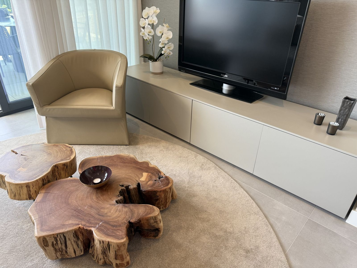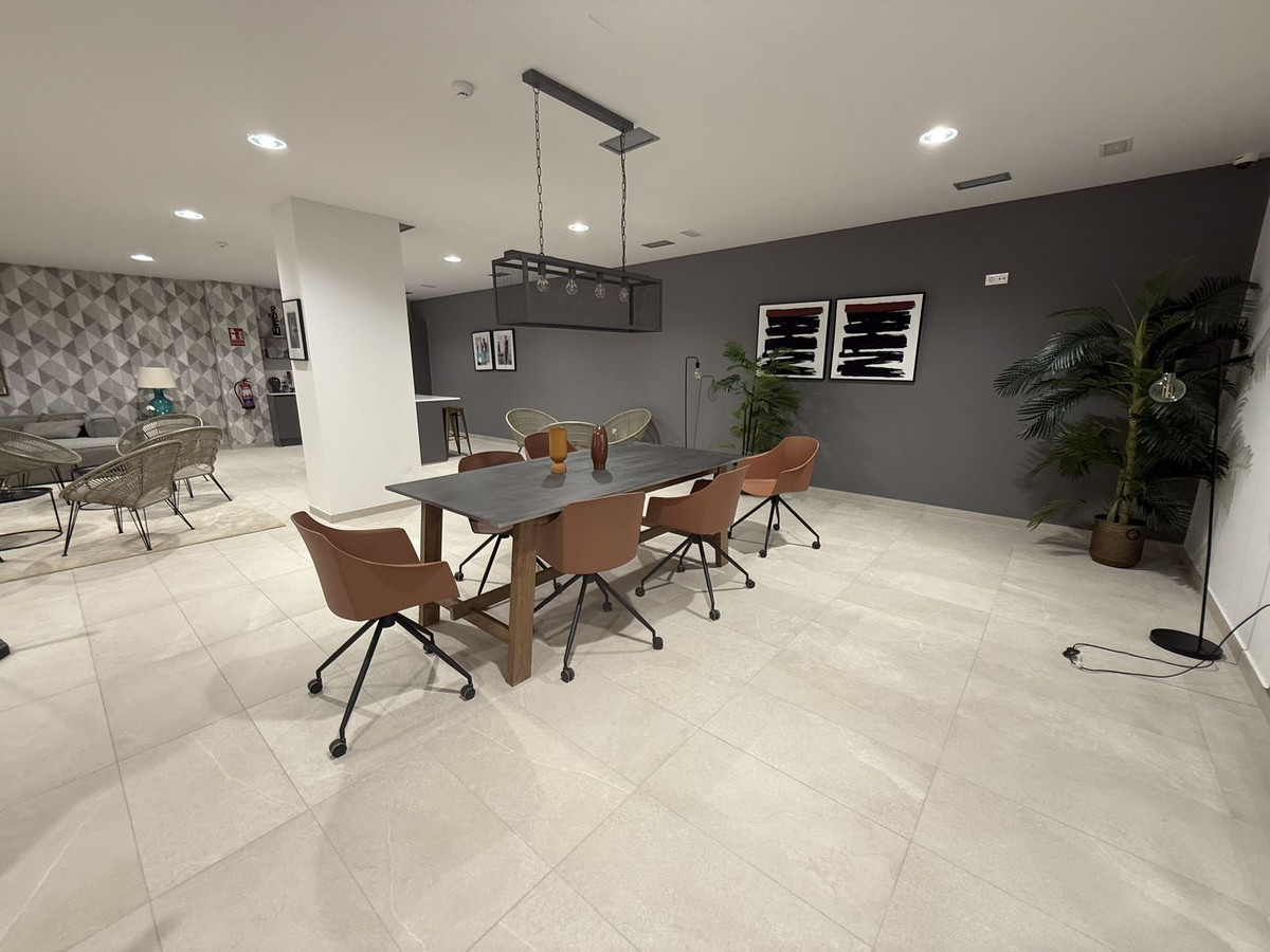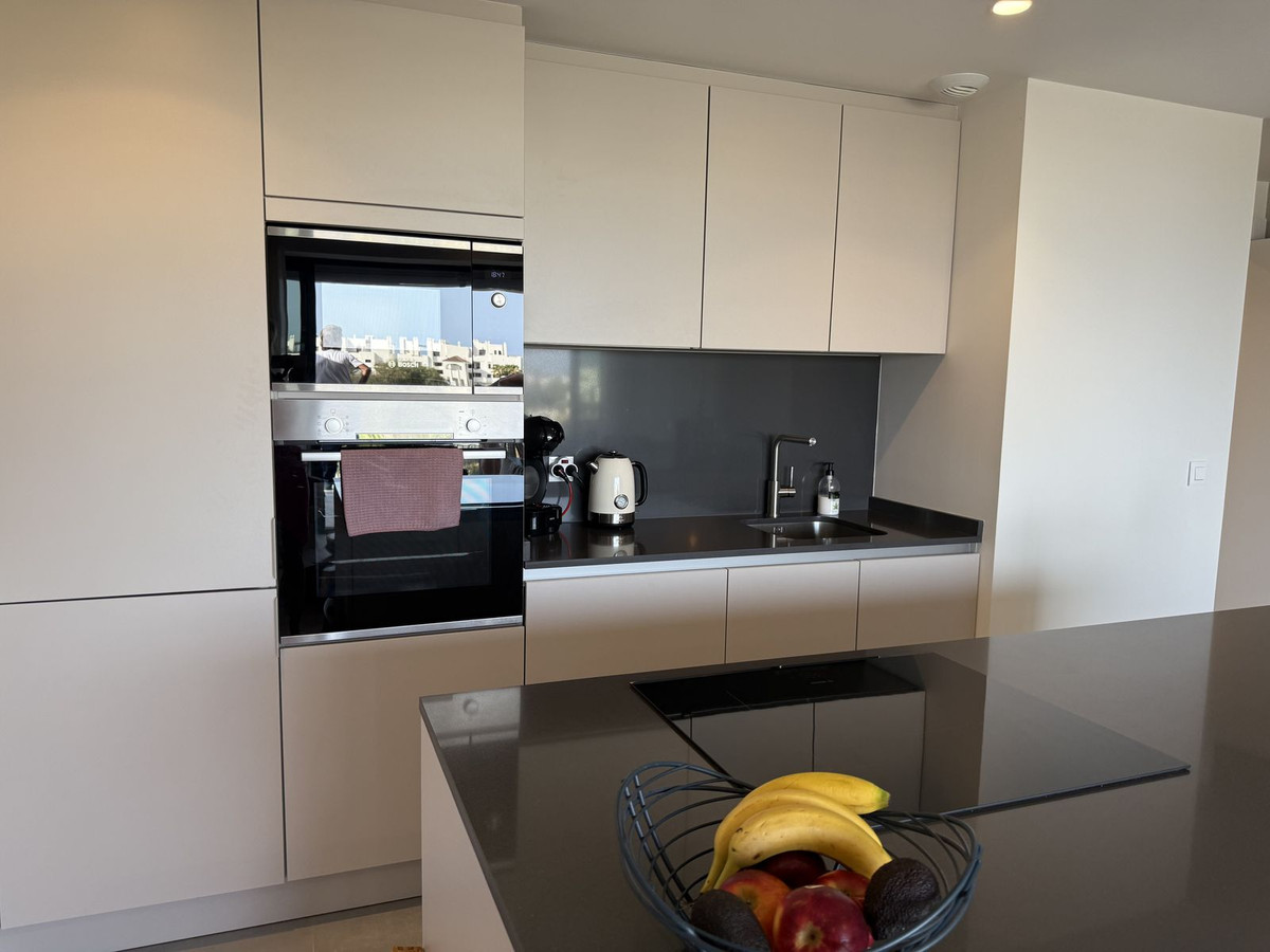The interior living space of 102 m² flows naturally into a spacious 28 m² terrace that faces southwest, ensuring sun from late morning until sunset. The layout includes an open-plan living and dining area with large sliding doors that open directly onto the terrace. The fully equipped kitchen is centered around a sleek island with integrated induction hob, combining elegance and functionality in a space designed for both cooking and socialising.
