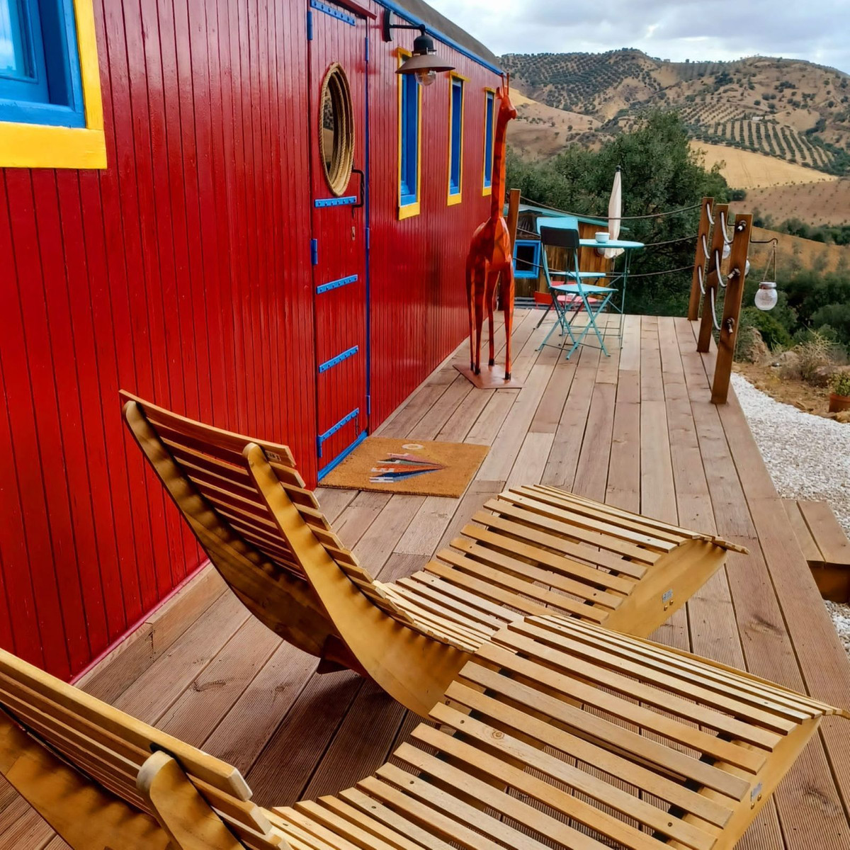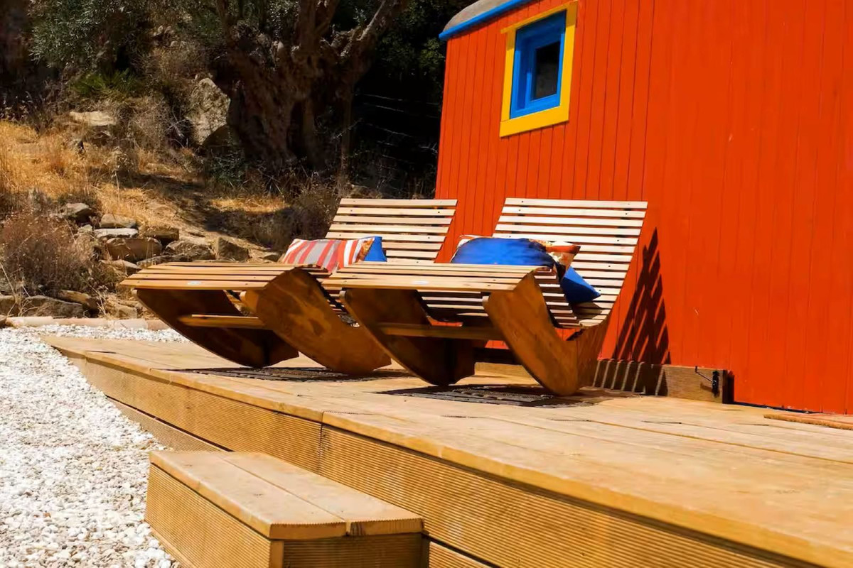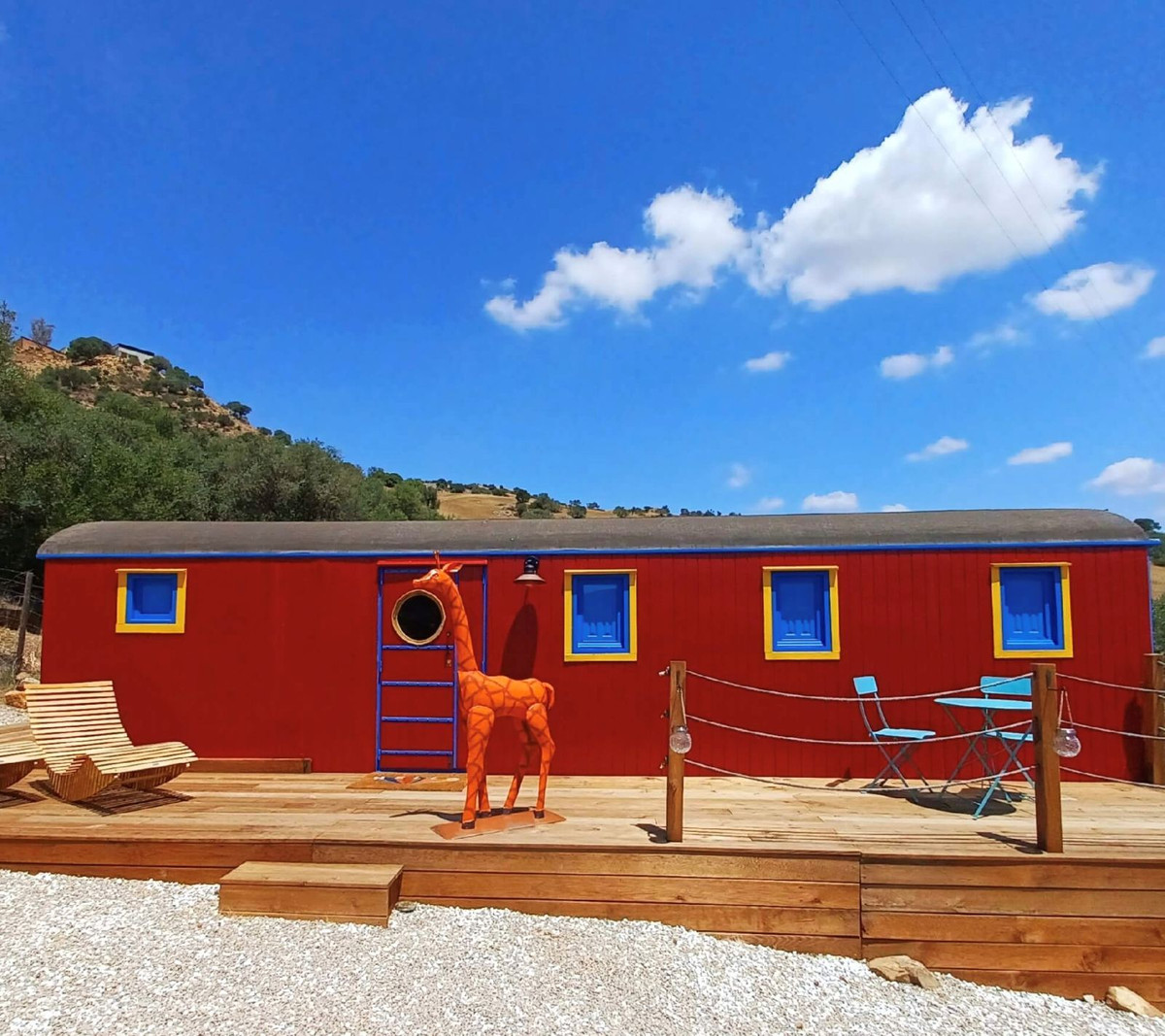 The circus wagon is surrounded by a full decking with rocking sun chairs and breakfast table.