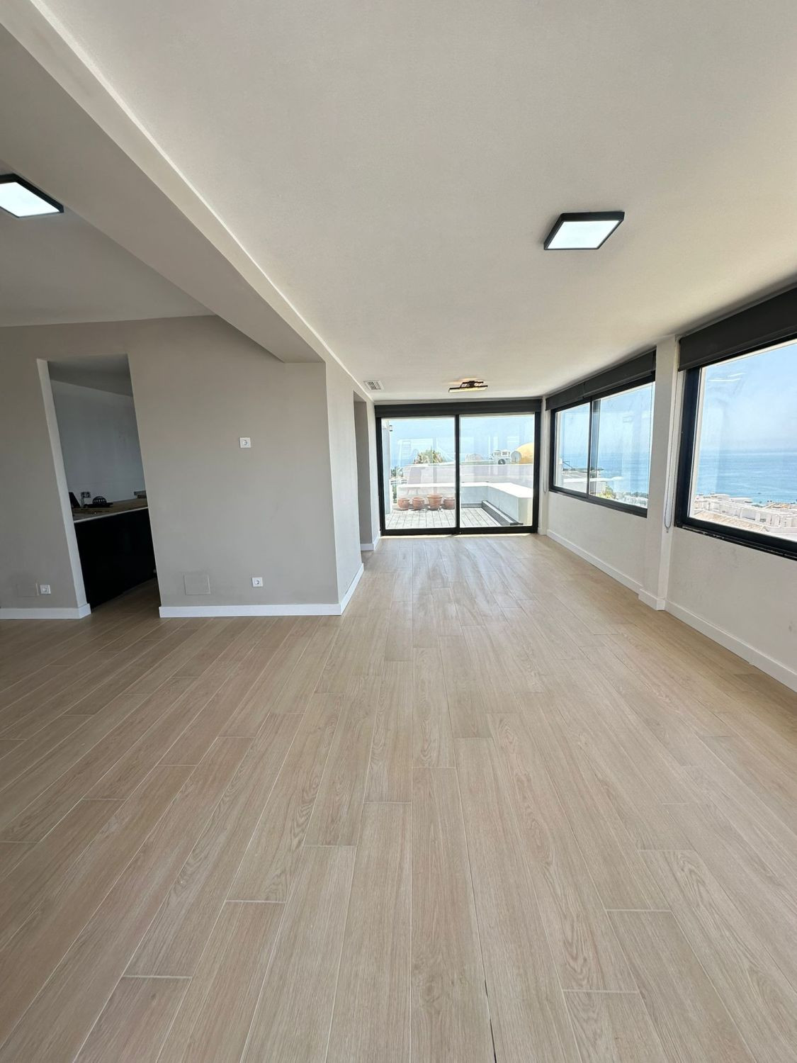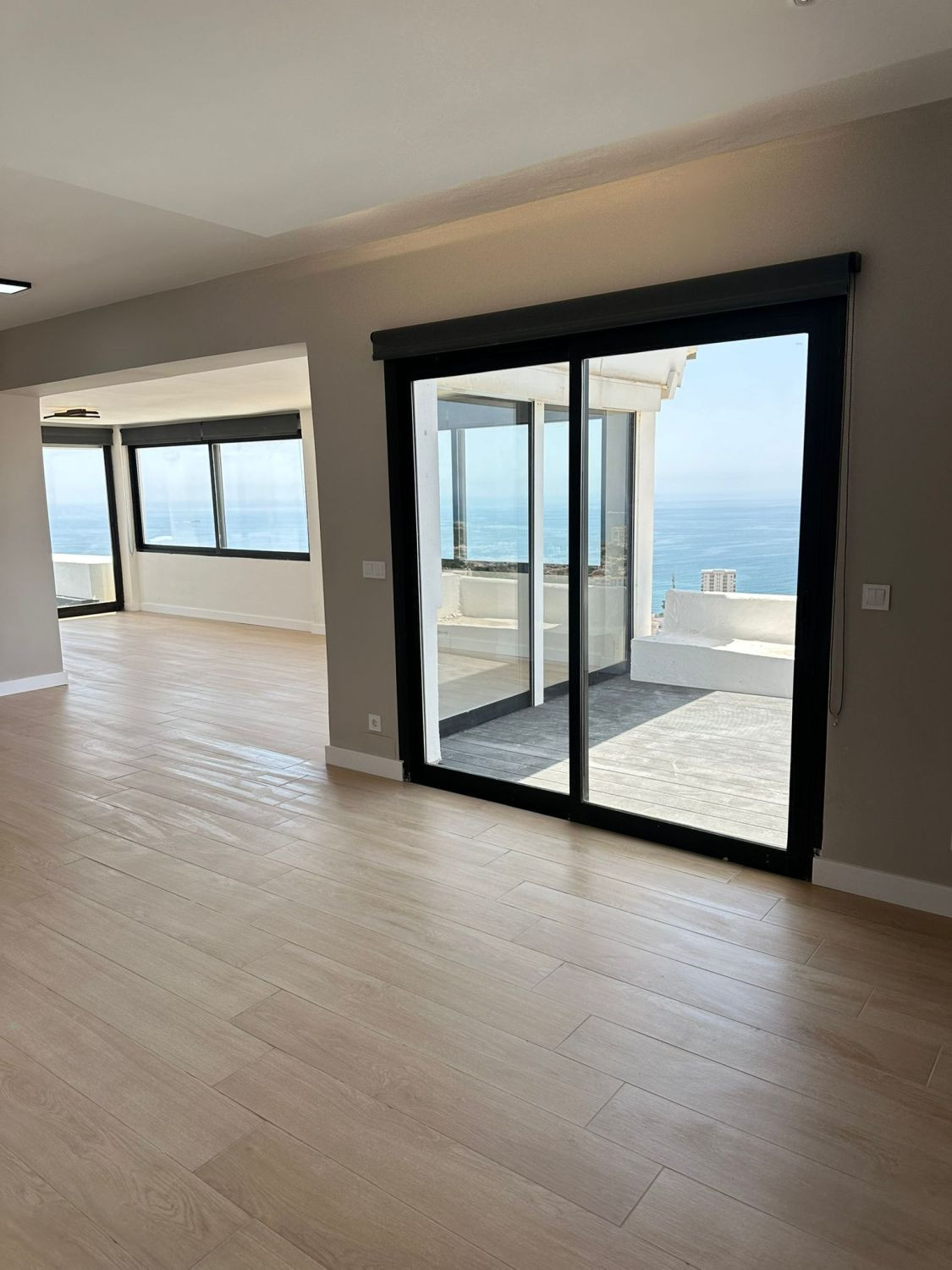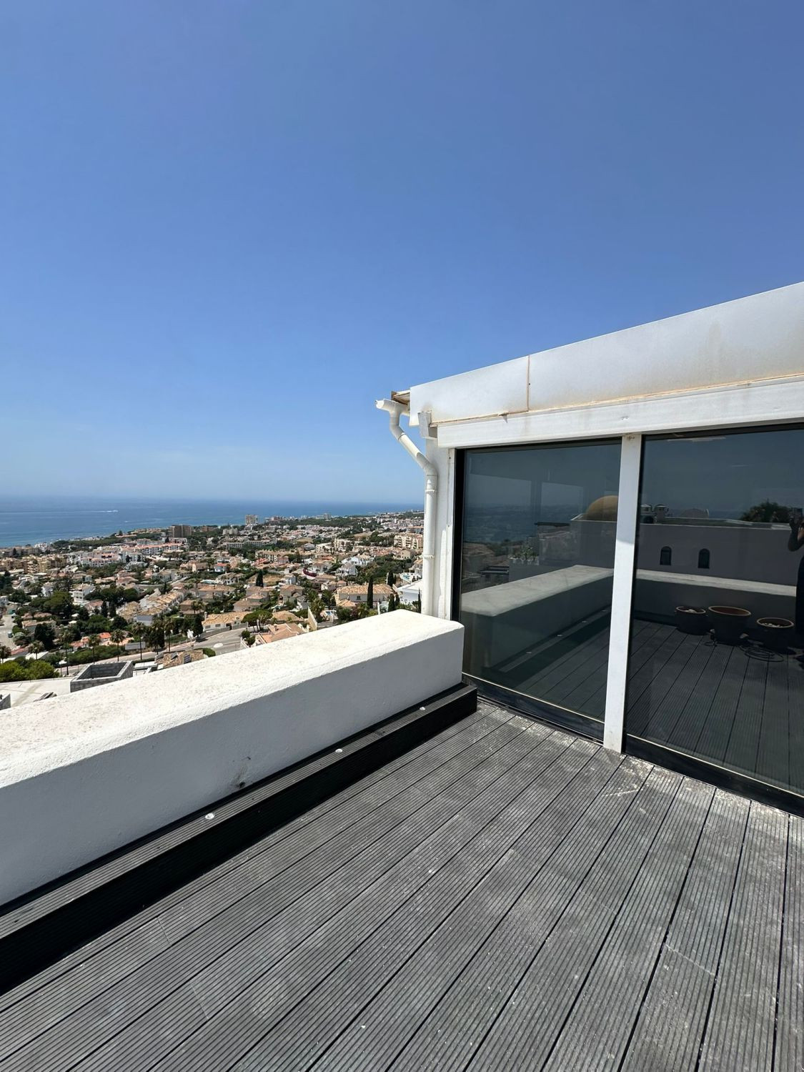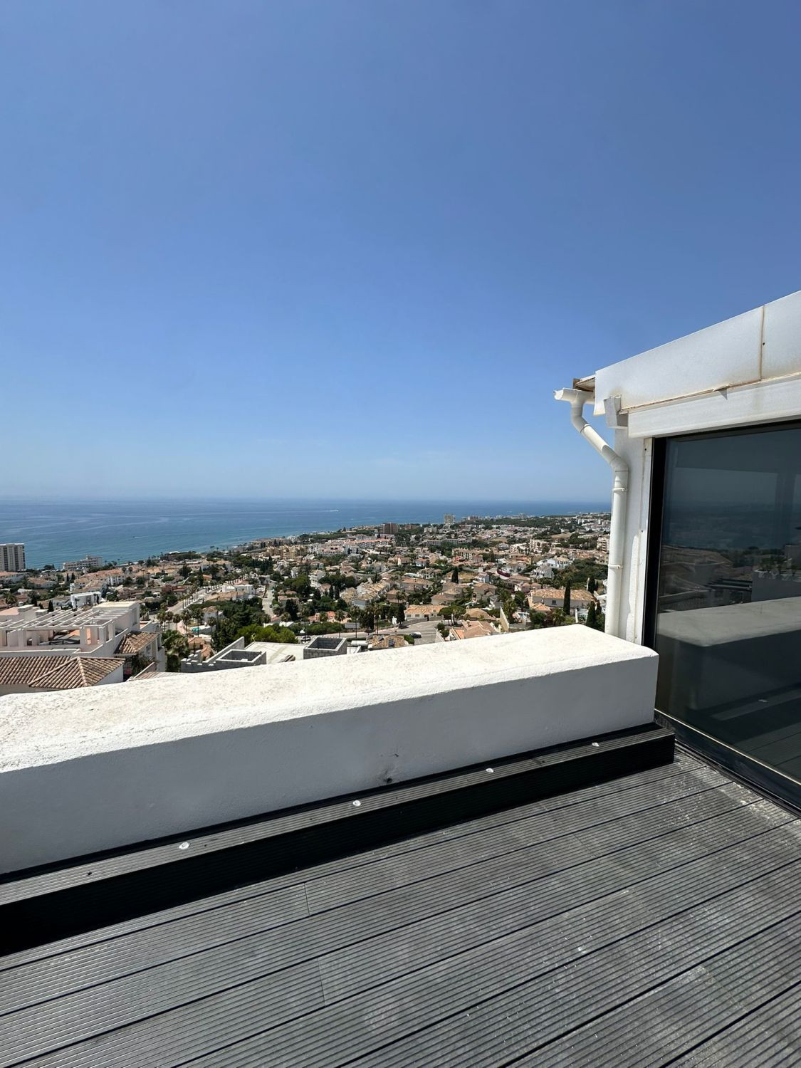 We offer this wonderful penthouse for sale in the coastal town of Mijas, province of Málaga. Located in a gated community with a communal pool and well-maintained landscaped areas, this apartment will make your stay a healthy experience, filling you with vitality and good humor. 17 km from the center of Málaga city, it will provide you with access to all the services and facilities you may need (shops, supermarkets, sports, educational, and health centers, public transportation, hospitality and catering services, government offices, and leisure facilities, such as the Miraflores Golf Course (1.7 km) or Torre Nueva Beach (2 km), among others. This wonderful home is located on a single floor and is located in the penthouse of a residential building. This first-floor apartment, with no elevator, occupies an exclusive wing of the floor, ensuring privacy as it is not shared with neighbors. It has a constructed area of ​​115 m², distributed among: 3 bedrooms with built-in wardrobes, a separate kitchen, two full bathrooms (one en suite), and a spacious living-dining room with access to a 22 m² terrace. This spacious area, which seems to divide the terrace in two, is located inside the living room. It features large windows and large glass doors, from which you can enjoy the beautiful 360º panoramic sea views in any season, regardless of the weather (it is sunny for most of the day). You can also spend unforgettable moments with your loved ones enjoying the beneficial Mediterranean climate on the terrace on summer nights.