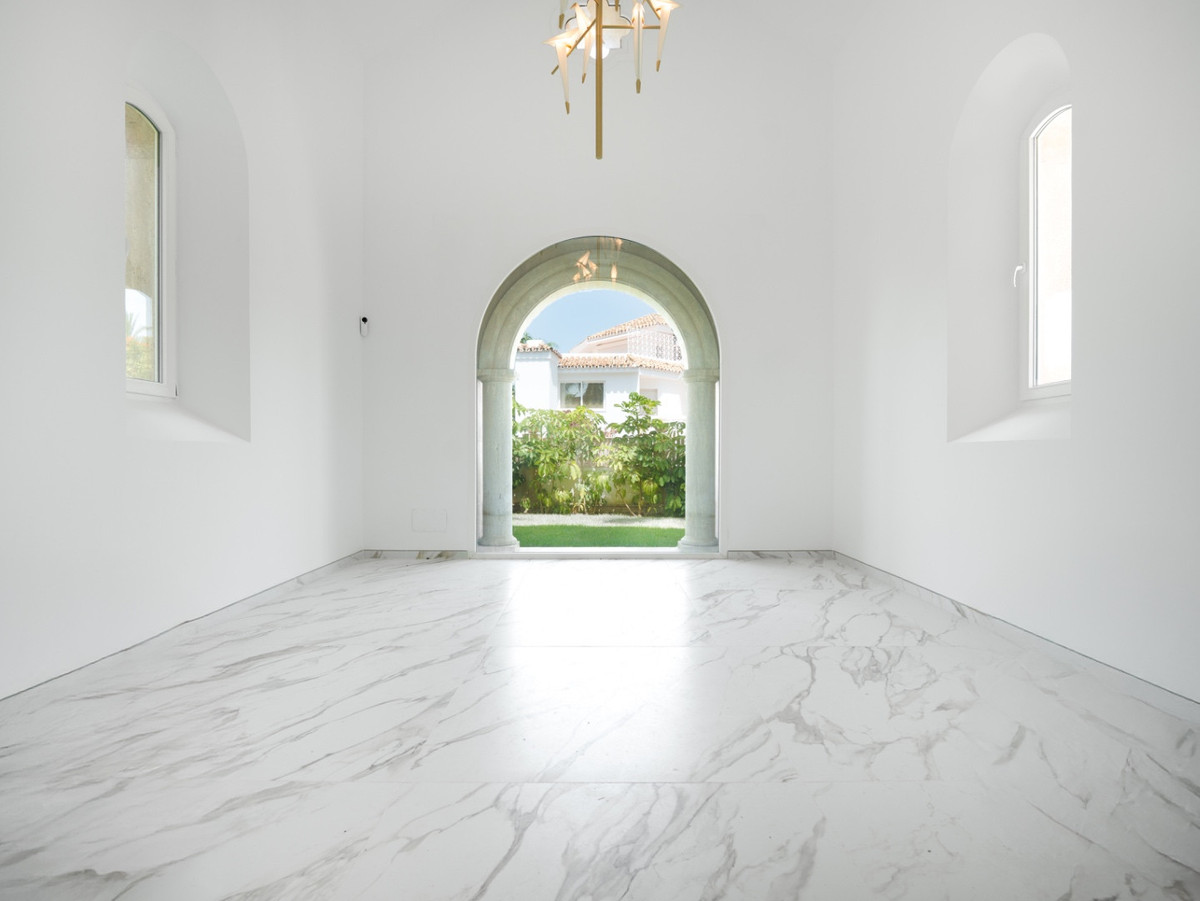 Tucked away in the exclusive beachside area of Los Monteros in Marbella East, just a short walk from the beach, this villa is truly one of a kind. Inspired by Venetian church architecture, it combines timeless European elegance with relaxed coastal living. Set on a generous 933 square metre plot, the four-bedroom, four-bathroom home—including two en-suites—is spread across three levels, offering a unique blend of style, comfort, and space. A grand entrance welcomes you with elegant pillars, arched doorways, and polished marble floors that run throughout the house, setting the tone for what’s to come.