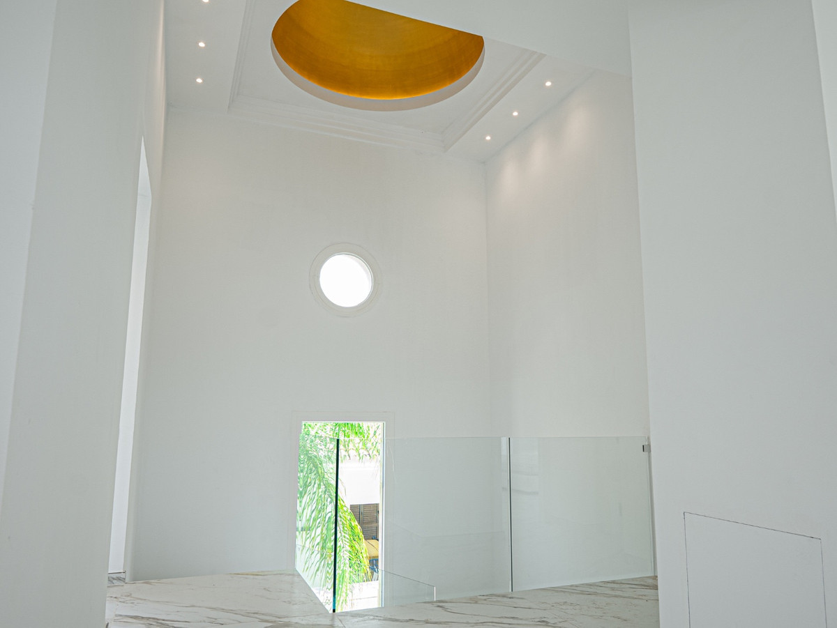 A glass balustrade staircase leads to the upper floors, where a domed ceiling casts soft natural light across the hallway. Each bedroom has floor-to-ceiling windows that flood the rooms with light, thanks to the southeast-facing orientation. The master suite is a peaceful retreat with a large walk-in dressing room featuring a central island, and a Juliet balcony that overlooks the private pool. On the lower level, there’s a flexible extra room that could serve as a gym, cinema room, or a private guest apartment, giving you the ability to customise the home, to suit your lifestyle.