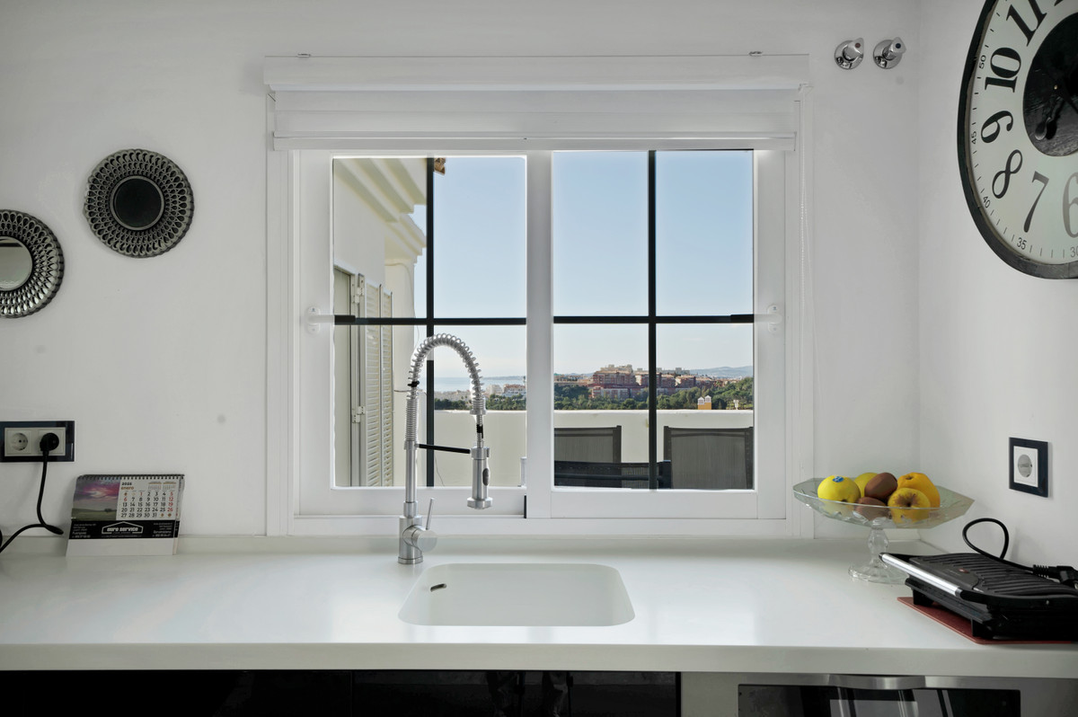 An open-plan kitchen flows seamlessly into the living room — light, marble, and views combining to create warmth and sophistication. Cooking here feels effortless, surrounded by laughter, wine, and sunlight filtering through double-glazed Climalit windows.