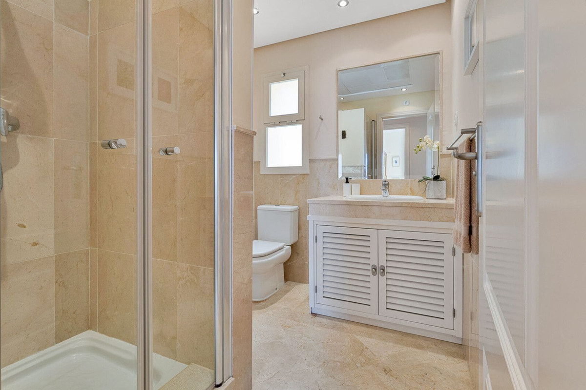 The master bedroom is both spacious and elegant, featuring direct access to the terrace, a large walk-in dressing room, and a luxurious en-suite bathroom with a walk-in shower and a bathtub with an additional shower overhead. The second bedroom is well-sized, with fitted wardrobes, and is served by an adjacent bathroom equipped with a large walk-in shower.
