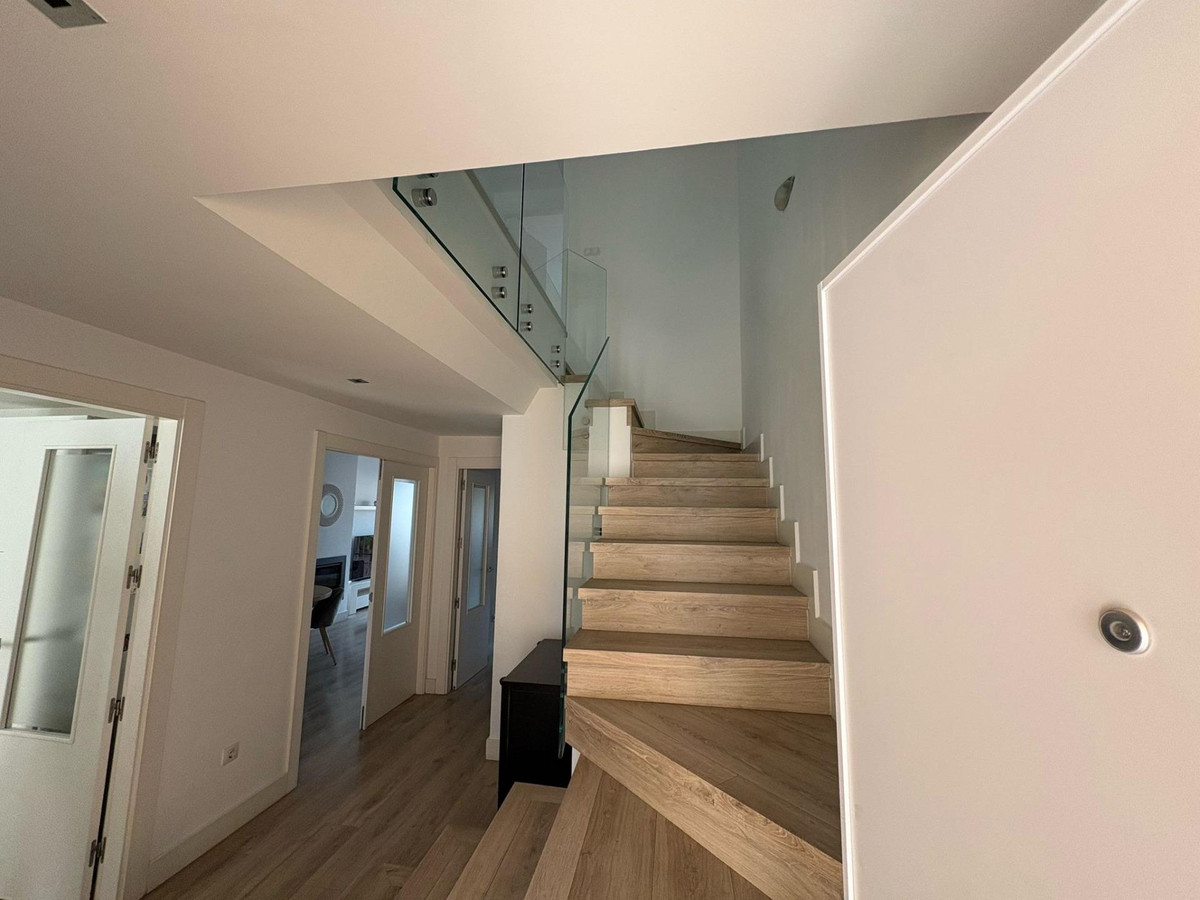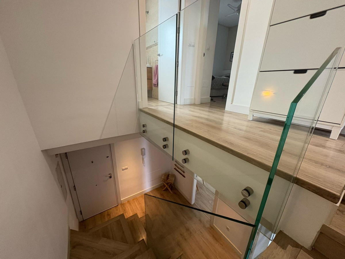 Upon entering, you’re welcomed by a spacious and bright foyer featuring a modern staircase with a tempered glass railing, adding a contemporary touch to the home. The main floor offers a functional layout with a fully equipped kitchen, separate laundry room, a full bathroom, one bedroom, and a spacious living-dining area with direct access to a generous terrace. From here, you can enjoy breathtaking open views of the Bay of Málaga — a true daily luxury.