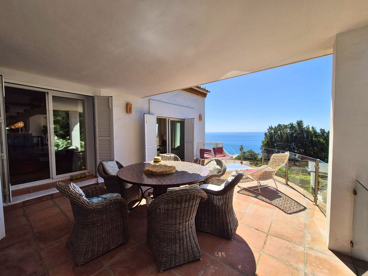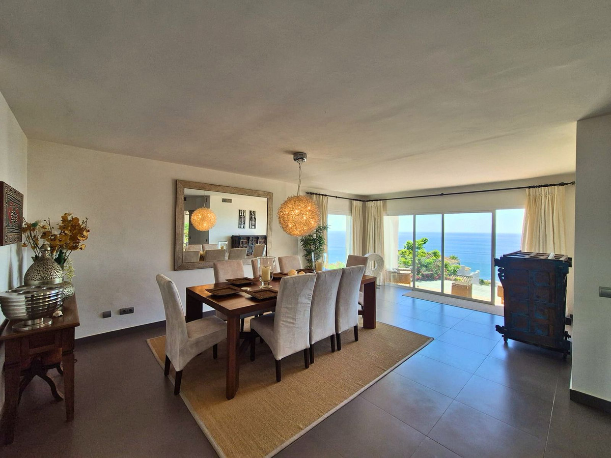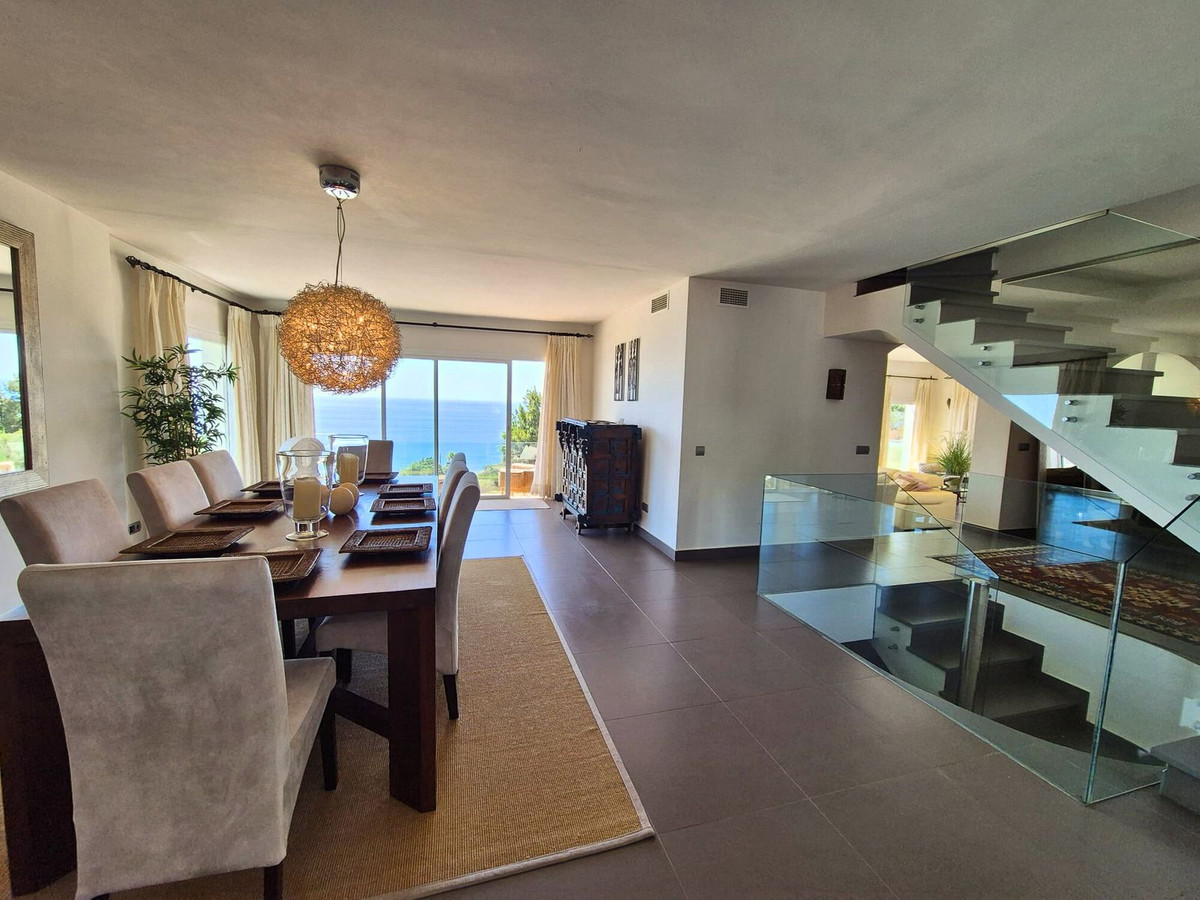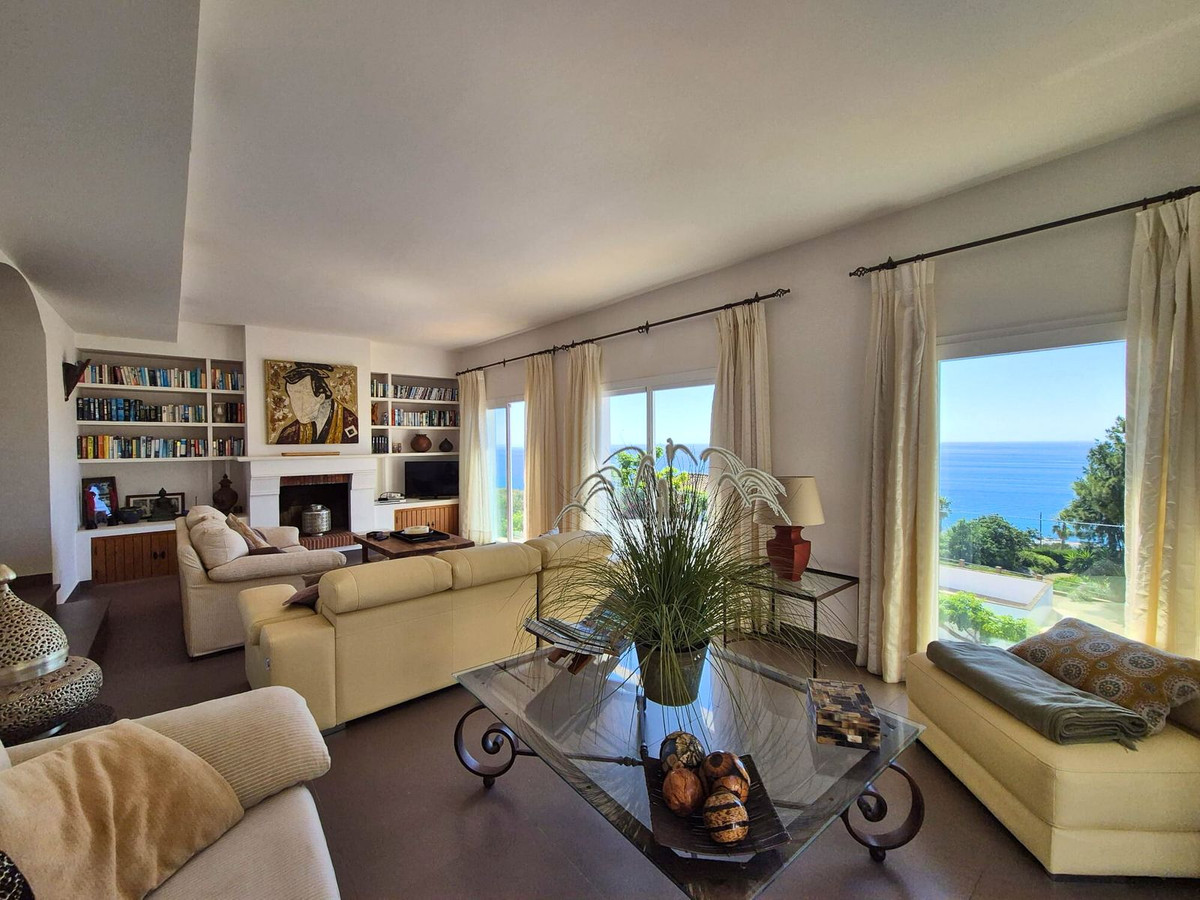 As you step inside, you're welcomed by a spacious entrance hall where the beautiful Mediterranean views immediately capture your attention. You’ll find a fully equipped kitchen with a separate laundry room, a spacious living room with fireplace, and a dining room that connects directly to a covered terrace ideal for indoor-outdoor living. There's also a guest toilet and another covered terrace accessible from several rooms.