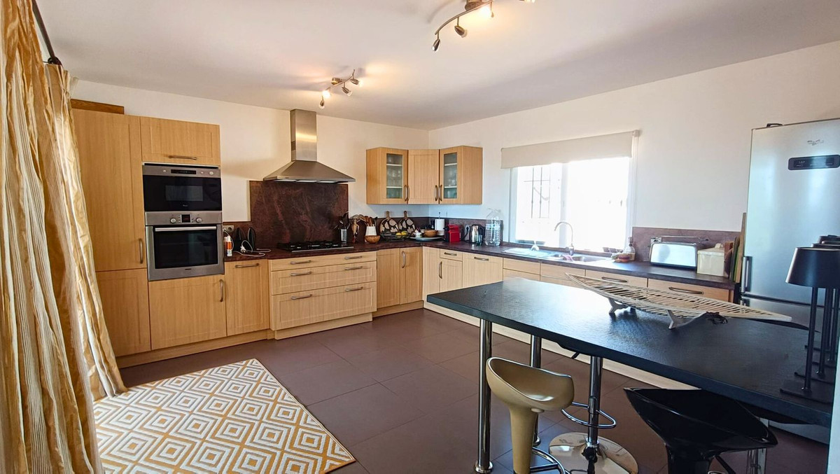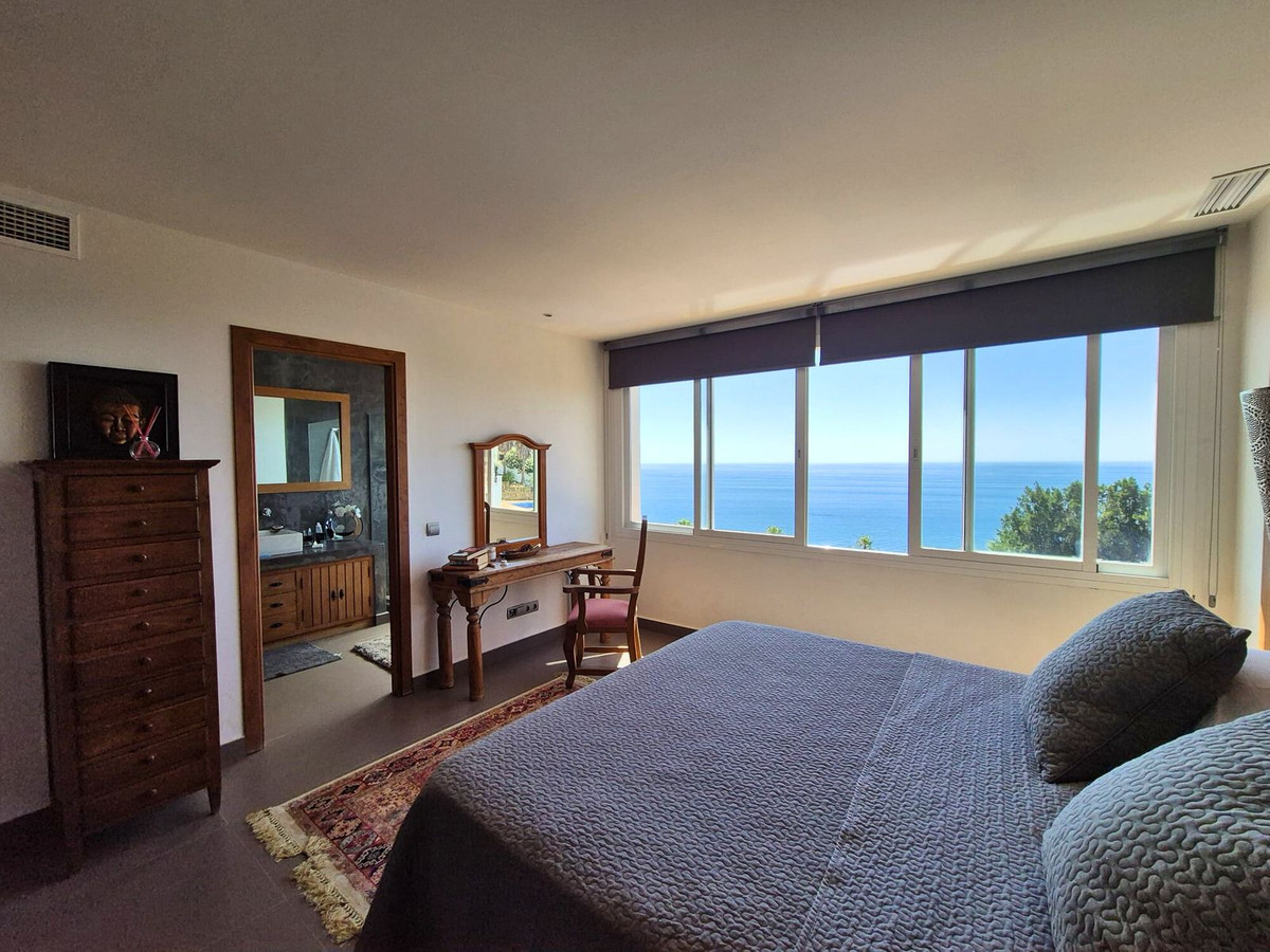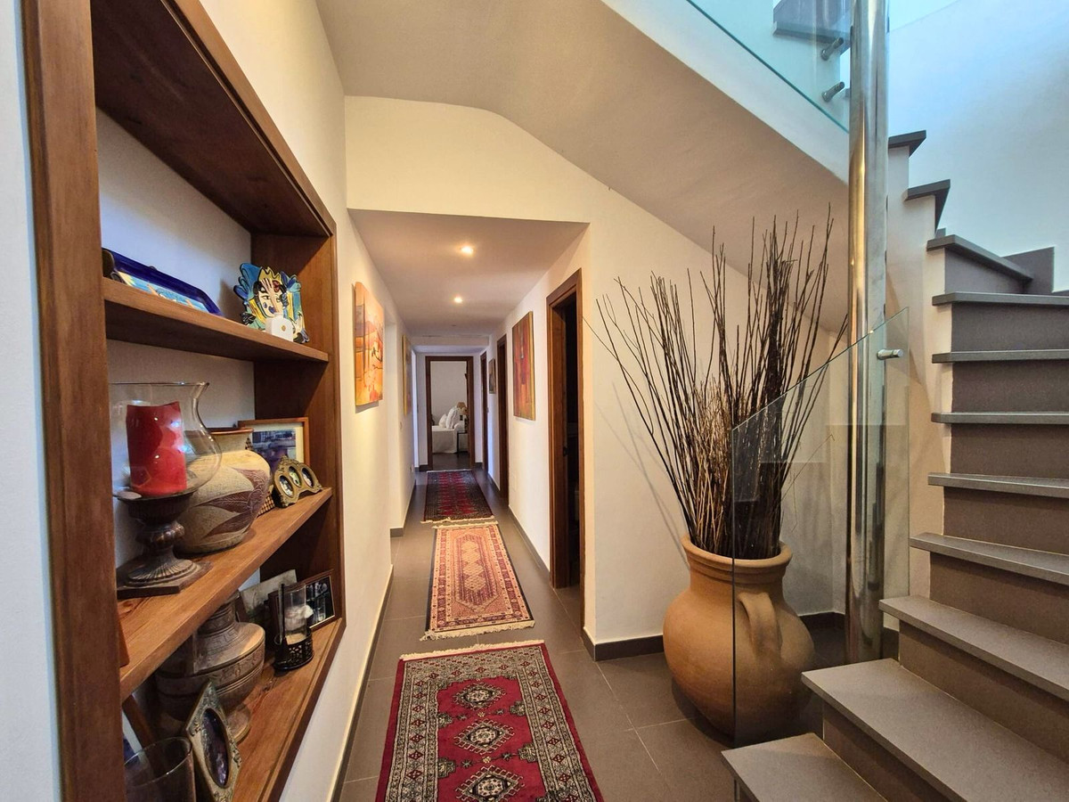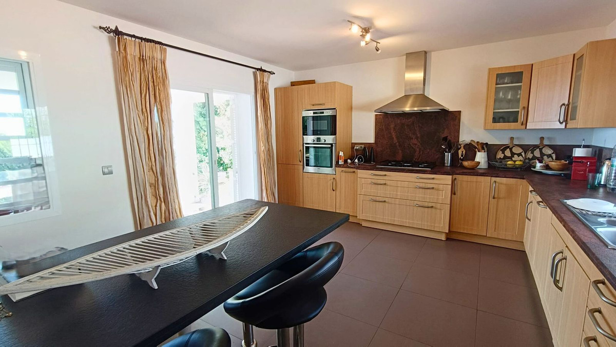 As you step inside, you're welcomed by a spacious entrance hall where the beautiful Mediterranean views immediately capture your attention. You’ll find a fully equipped kitchen with a separate laundry room, a spacious living room with fireplace, and a dining room that connects directly to a covered terrace ideal for indoor-outdoor living. There's also a guest toilet and another covered terrace accessible from several rooms.