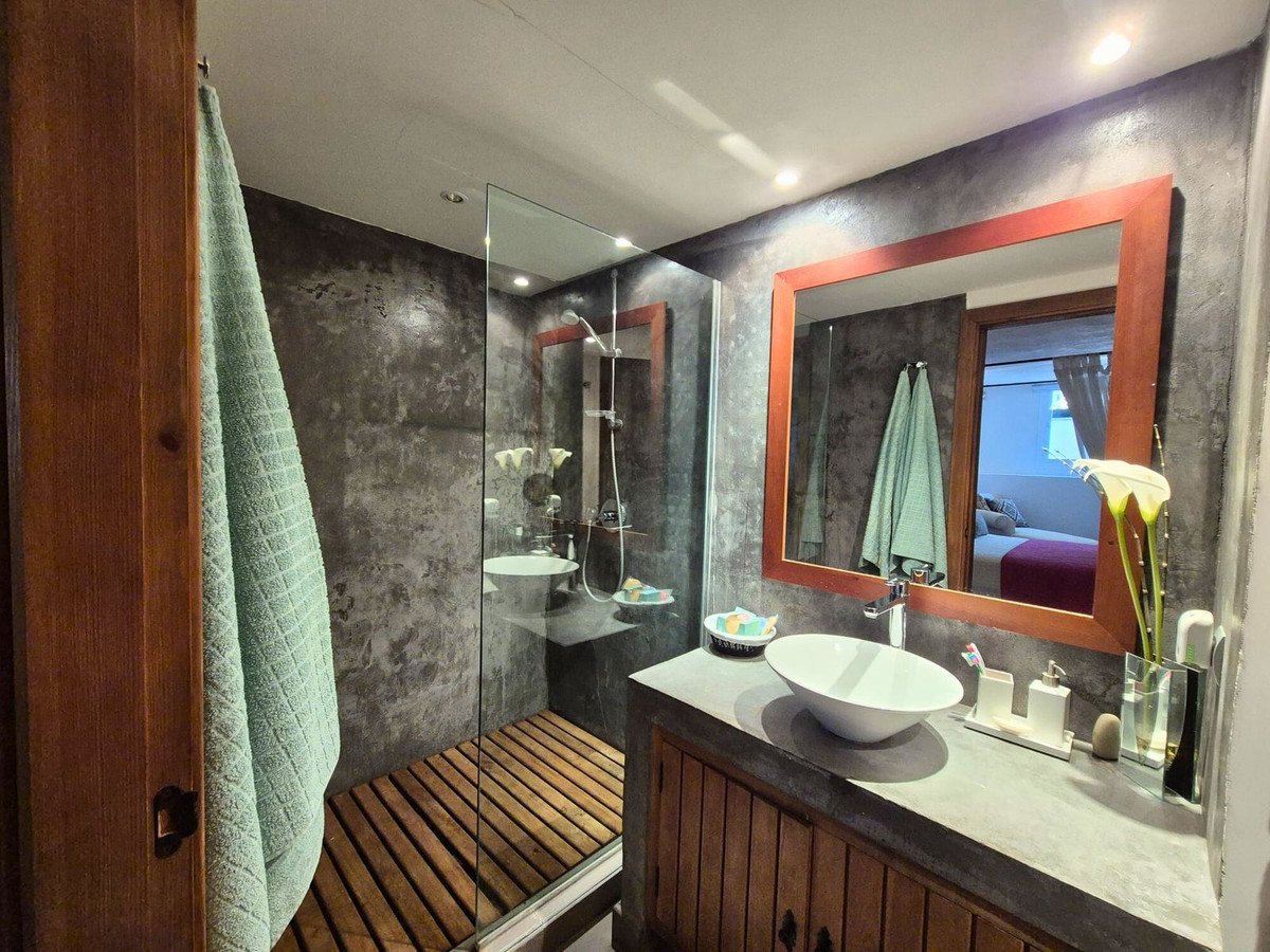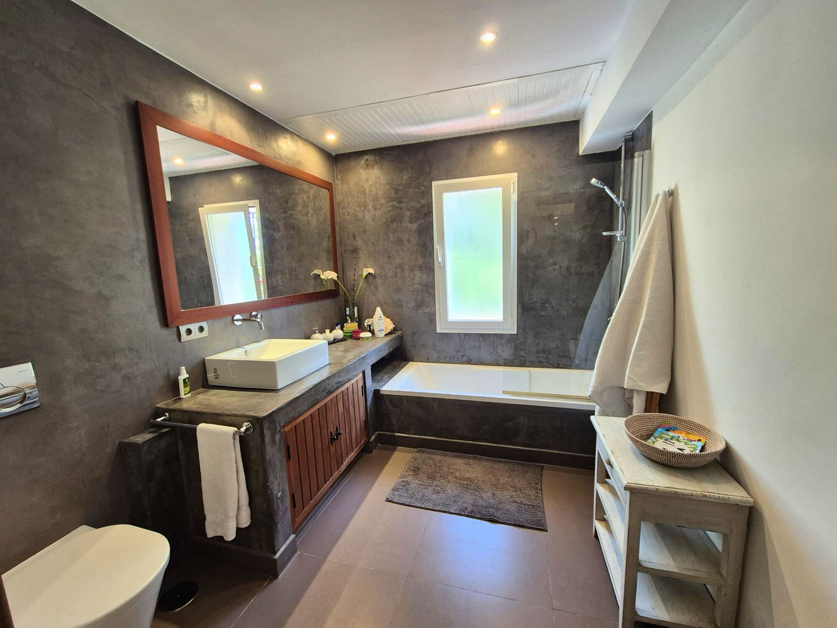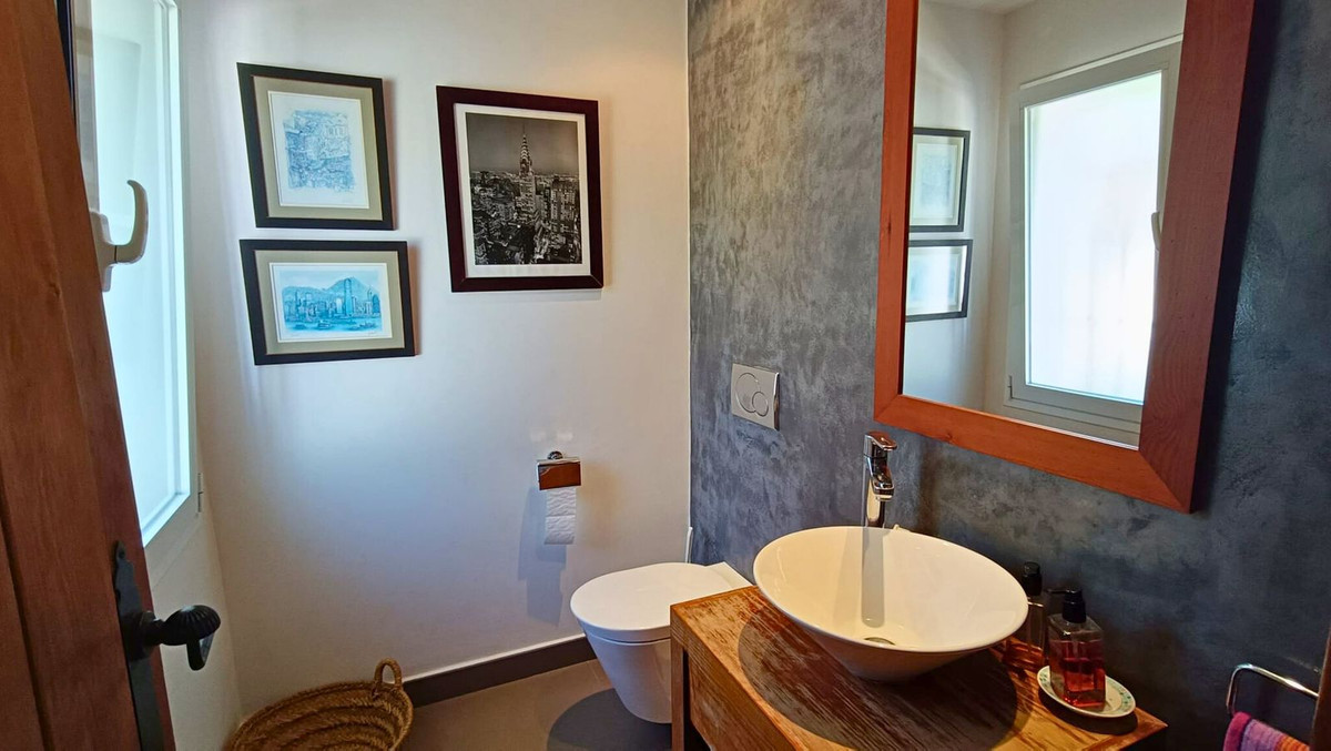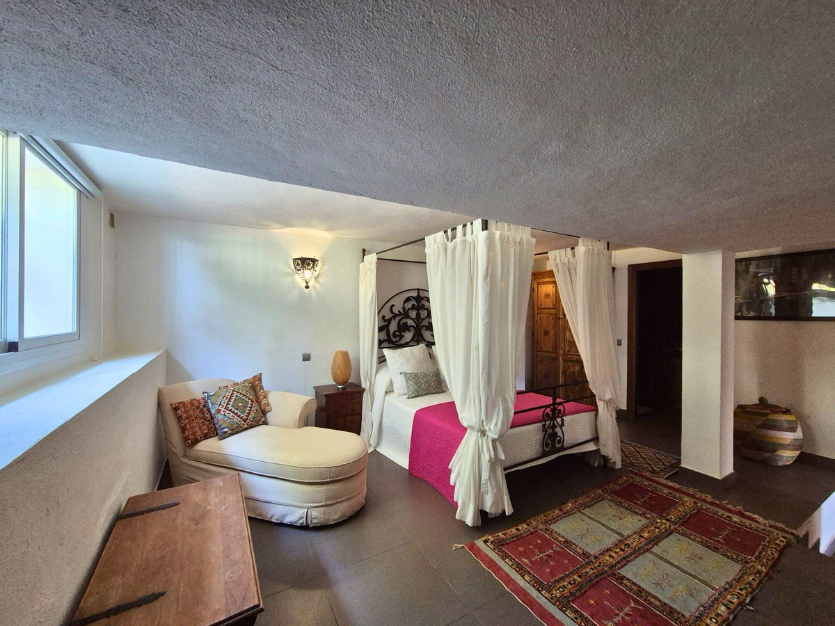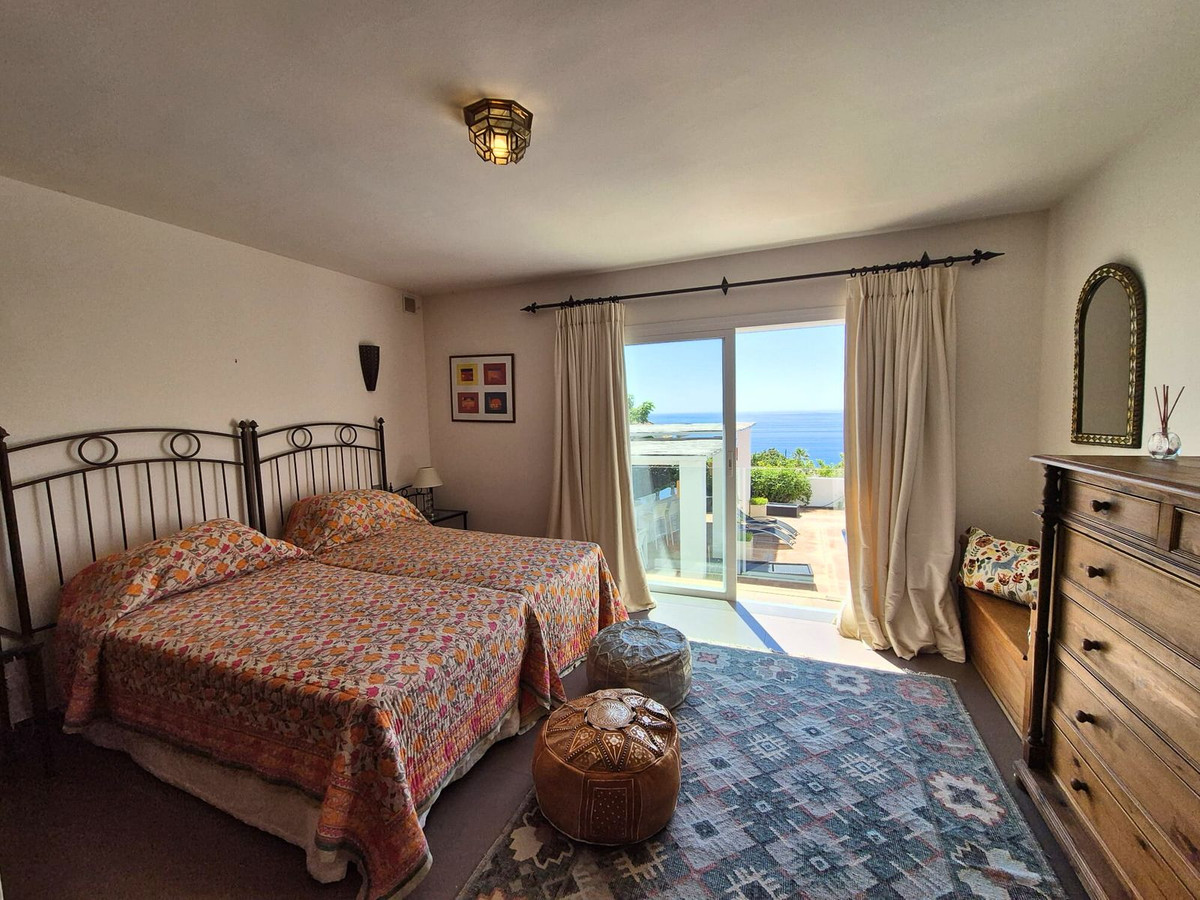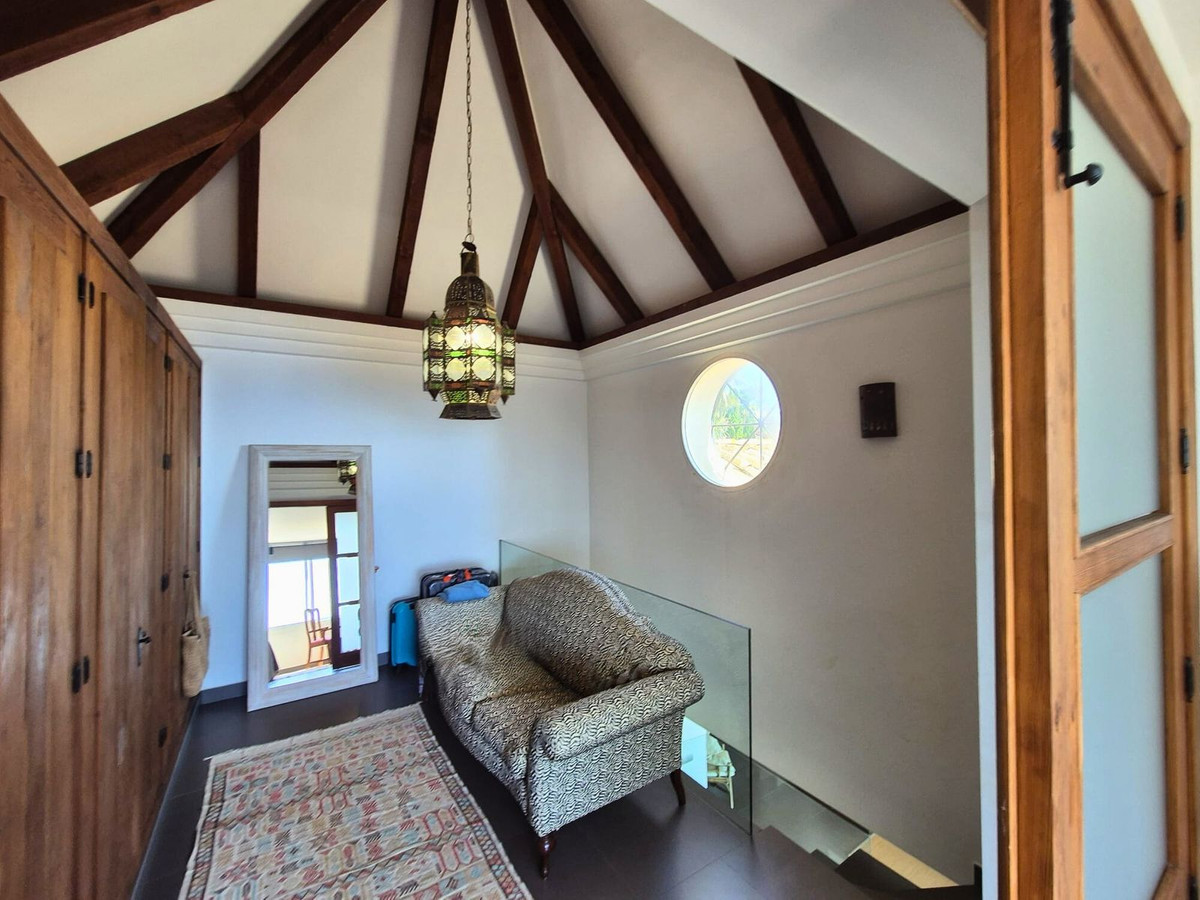The master suite occupies the entire upper floor, offering ultimate privacy. It features a charming dressing area with high vaulted ceilings and exposed wooden beams, adding warmth and character to the space. An en-suite bathroom and stunning sea views complete this peaceful and private retreat.