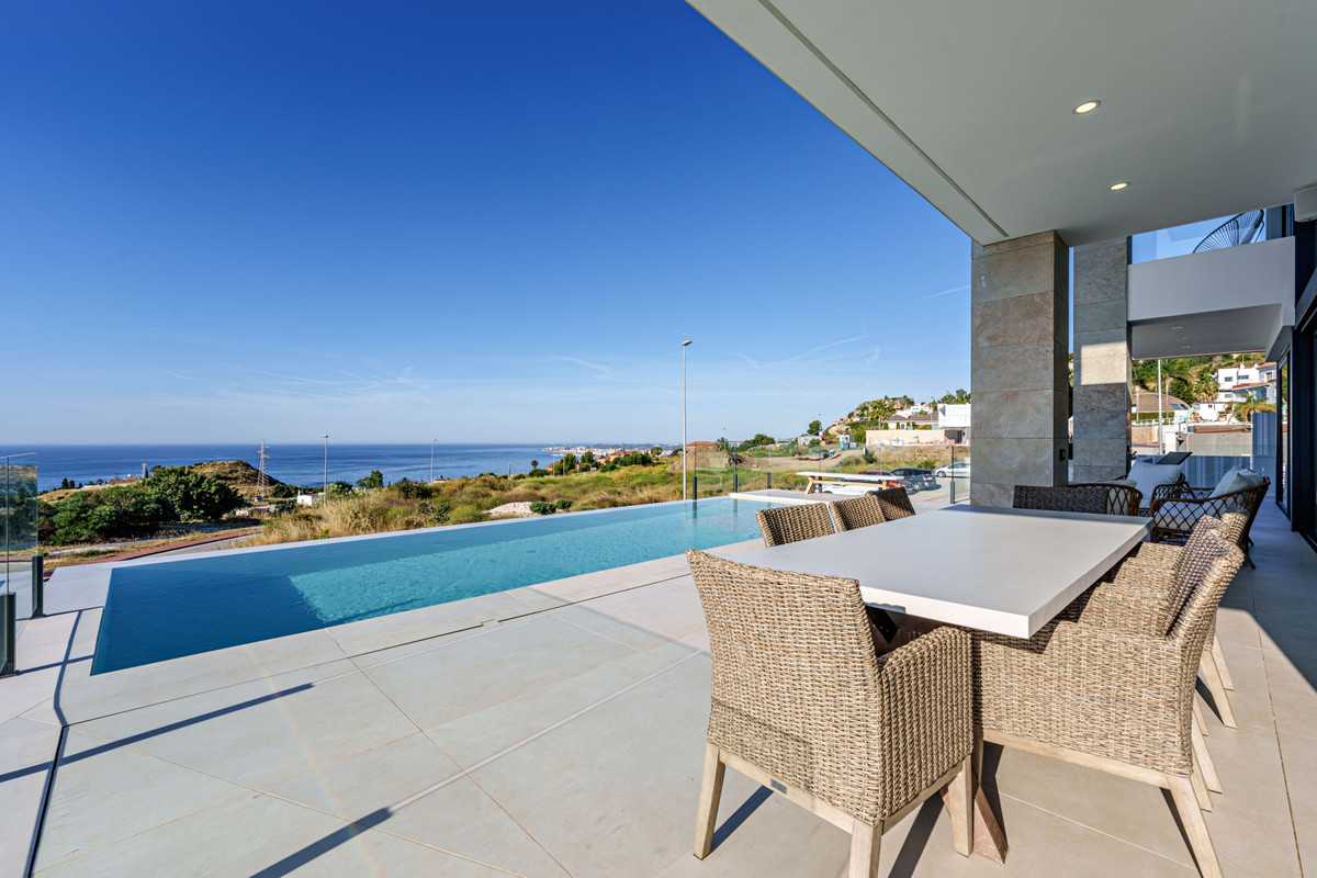 This south-facing contemporary villa in Benalmádena Costa offers impressive 180º views of the sea and nearby mountains. Set on a 650 m² plot with 400 m² of built space distributed over three levels, the property combines comfort, style, and functional design in one of the most desirable areas of the Costa del Sol. The property is surrounded by green areas where new villas are not permitted to be built.